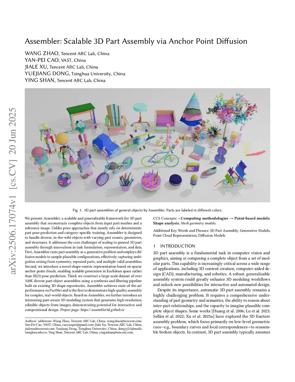 We present Assembler, a scalable and generalizable framework for 3D part assembly that reconstructs complete objects from input part meshes and a reference image. Unlike prior approaches that mostly rely on deterministic part pose prediction and category-specific training, Assembler is designed to handle diverse, in-the-wild objects with varying part counts, geometries, and structures. It addresses the core challenges of scaling to general 3D part assembly through innovations in task formulation, representation, and data. First, Assembler casts part assembly as a generative problem and employs diffusion models to sample plausible configurations, effectively capturing ambiguities arising from symmetry, repeated parts, and multiple valid assemblies. Second, we introduce a novel shape-centric representation based on sparse anchor point clouds, enabling scalable generation in Euclidean space rather than SE(3) pose prediction. Third, we construct a large-scale dataset of over 320K diverse part-object assemblies using a synthesis and filtering pipeline built on existing 3D shape repositories. Assembler achieves state-of-the-art performance on PartNet and is the first to demonstrate high-quality assembly for complex, real-world objects. Based on Assembler, we further introduce an interesting part-aware 3D modeling system that generates high-resolution, editable objects from images, demonstrating potential for interactive and compositional design. Project page:this https URL