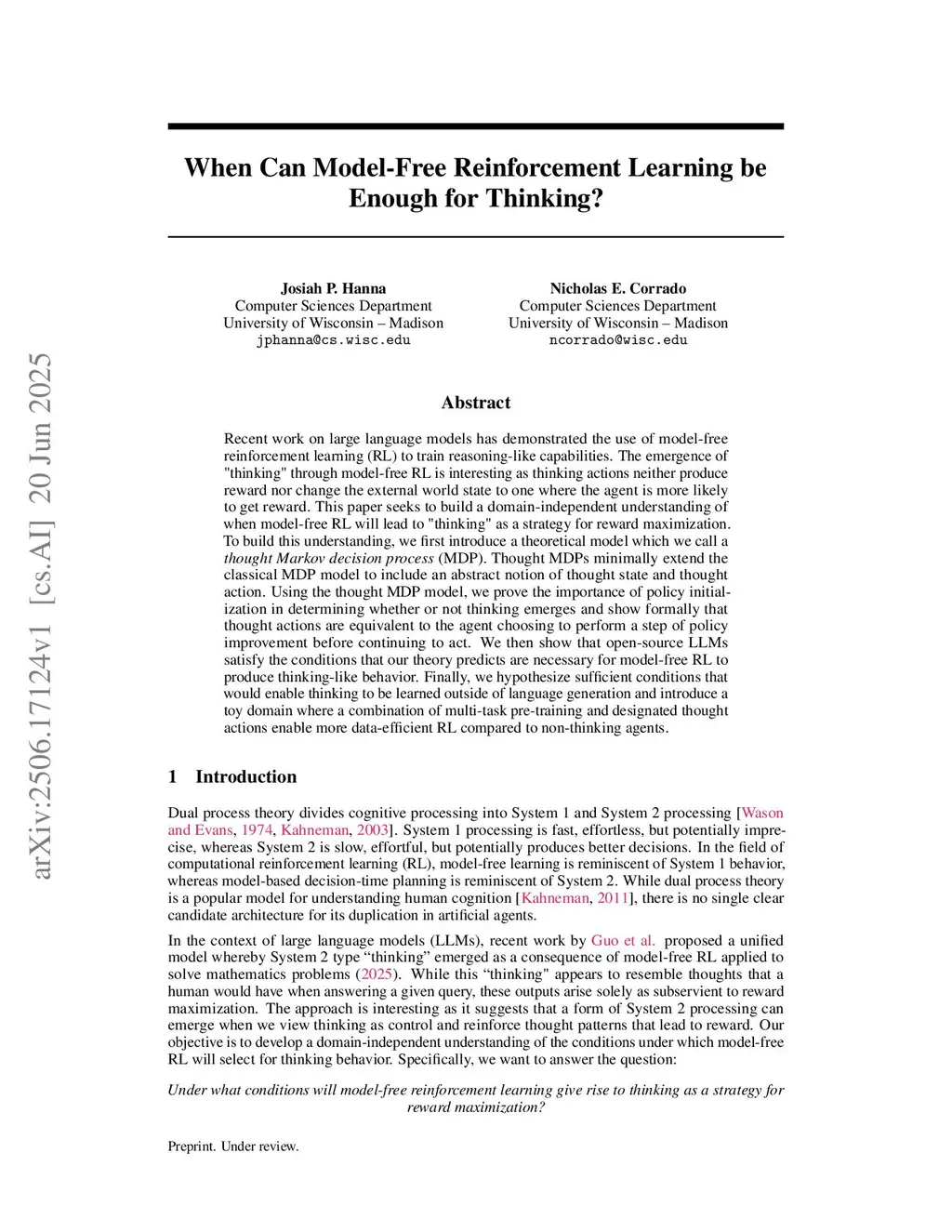 Recent work on large language models has demonstrated the use of model-free reinforcement learning (RL) to train reasoning-like capabilities. The emergence of "thinking" through model-free RL is interesting as thinking actions neither produce reward nor change the external world state to one where the agent is more likely to get reward. This paper seeks to build a domain-independent understanding of when model-free RL will lead to such "thinking" as a strategy for reward maximization. To build this understanding, we first introduce a theoretical model which we call a thought Markov decision process (MDP). Thought MDPs minimally extend the classical MDP model to include an abstract notion of thought state and thought action. Using the thought MDP model, we prove the importance of policy initialization in determining whether or not thinking emerges and show formally that thought actions are equivalent to the agent choosing to perform a step of policy improvement before continuing to act. We then show that open-source LLMs satisfy the conditions that our theory predicts are necessary for model-free RL to produce thinking-like behavior. Finally, we hypothesize sufficient conditions that would enable thinking to be learned outside of language generation and introduce a toy domain where a combination of multi-task pre-training and designated thought actions enable more data-efficient RL compared to non-thinking agents.