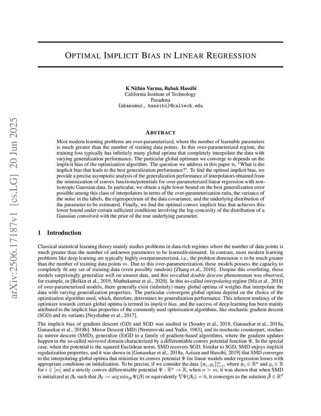 Most modern learning problems are over-parameterized, where the number of learnable parameters is much greater than the number of training data points. In this over-parameterized regime, the training loss typically has infinitely many global optima that completely interpolate the data with varying generalization performance. The particular global optimum we converge to depends on the implicit bias of the optimization algorithm. The question we address in this paper is, ``What is the implicit bias that leads to the best generalization performance?". To find the optimal implicit bias, we provide a precise asymptotic analysis of the generalization performance of interpolators obtained from the minimization of convex functions/potentials for over-parameterized linear regression with non-isotropic Gaussian data. In particular, we obtain a tight lower bound on the best generalization error possible among this class of interpolators in terms of the over-parameterization ratio, the variance of the noise in the labels, the eigenspectrum of the data covariance, and the underlying distribution of the parameter to be estimated. Finally, we find the optimal convex implicit bias that achieves this lower bound under certain sufficient conditions involving the log-concavity of the distribution of a Gaussian convolved with the prior of the true underlying parameter.