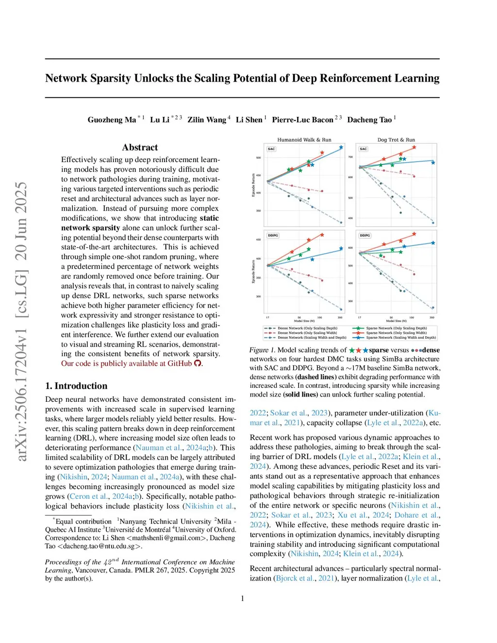 Effectively scaling up deep reinforcement learning models has proven notoriously difficult due to network pathologies during training, motivating various targeted interventions such as periodic reset and architectural advances such as layer normalization. Instead of pursuing more complex modifications, we show that introducing static network sparsity alone can unlock further scaling potential beyond their dense counterparts with state-of-the-art architectures. This is achieved through simple one-shot random pruning, where a predetermined percentage of network weights are randomly removed once before training. Our analysis reveals that, in contrast to naively scaling up dense DRL networks, such sparse networks achieve both higher parameter efficiency for network expressivity and stronger resistance to optimization challenges like plasticity loss and gradient interference. We further extend our evaluation to visual and streaming RL scenarios, demonstrating the consistent benefits of network sparsity.