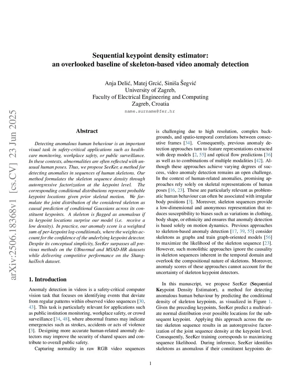 Detecting anomalous human behaviour is an important visual task in safety-critical applications such as healthcare monitoring, workplace safety, or public surveillance. In these contexts, abnormalities are often reflected with unusual human poses. Thus, we propose SeeKer, a method for detecting anomalies in sequences of human skeletons. Our method formulates the skeleton sequence density through autoregressive factorization at the keypoint level. The corresponding conditional distributions represent probable keypoint locations given prior skeletal motion. We formulate the joint distribution of the considered skeleton as causal prediction of conditional Gaussians across its constituent keypoints. A skeleton is flagged as anomalous if its keypoint locations surprise our model (i.e. receive a low density). In practice, our anomaly score is a weighted sum of per-keypoint log-conditionals, where the weights account for the confidence of the underlying keypoint detector. Despite its conceptual simplicity, SeeKer surpasses all previous methods on the UBnormal and MSAD-HR datasets while delivering competitive performance on the ShanghaiTech dataset.