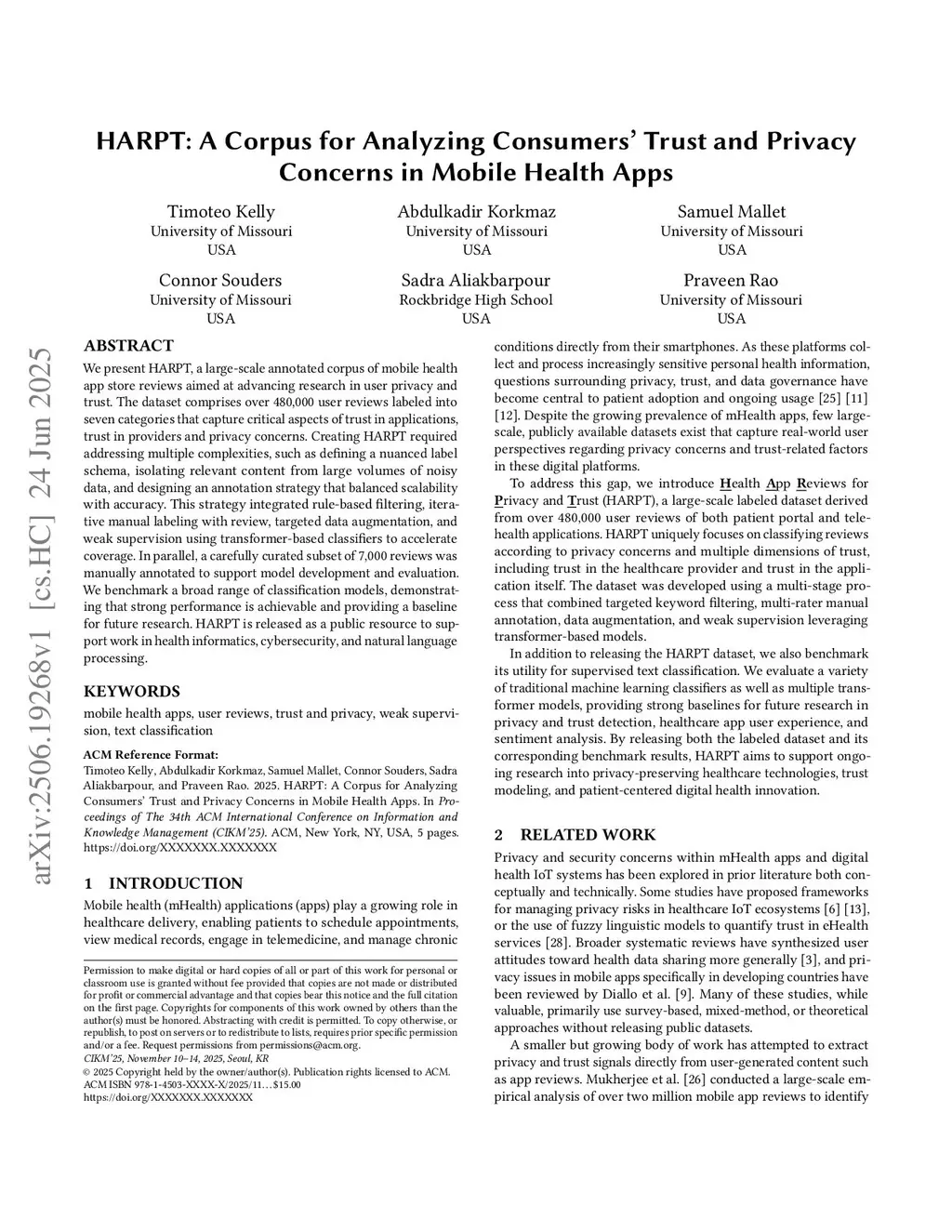 Background: User reviews of Telehealth and Patient Portal mobile applications (apps) hereon referred to as electronic health (eHealth) apps are a rich source of unsolicited patient feedback, revealing critical insights into patient perceptions. However, the lack of large-scale, annotated datasets specific to privacy and trust has limited the ability of researchers to systematically analyze these concerns using natural language processing (NLP) techniques.Objective: This study aims to develop and benchmark Health App Reviews for Privacy & Trust (HARPT), a large-scale annotated corpus of patient reviews from eHealth apps to advance research in patient privacy and trust.Methods: We employed a multistage data construction strategy. This integrated keyword-based filtering, iterative manual labeling with review, targeted data augmentation, and weak supervision using transformer-based classifiers. A curated subset of 7,000 reviews was manually annotated to support machine learning model development and evaluation. The resulting dataset was used to benchmark a broad range of models.Results: The HARPT corpus comprises 480,000 patient reviews annotated across seven categories capturing critical aspects of trust in the application (TA), trust in the provider (TP), and privacy concerns (PC). We provide comprehensive benchmark performance for a range of machine learning models on the manually annotated subset, establishing a baseline for future research.Conclusions: The HARPT corpus is a significant resource for advancing the study of privacy and trust in the eHealth domain. By providing a large-scale, annotated dataset and initial benchmarks, this work supports reproducible research in usable privacy and trust within health informatics. HARPT is released under an open resource license.