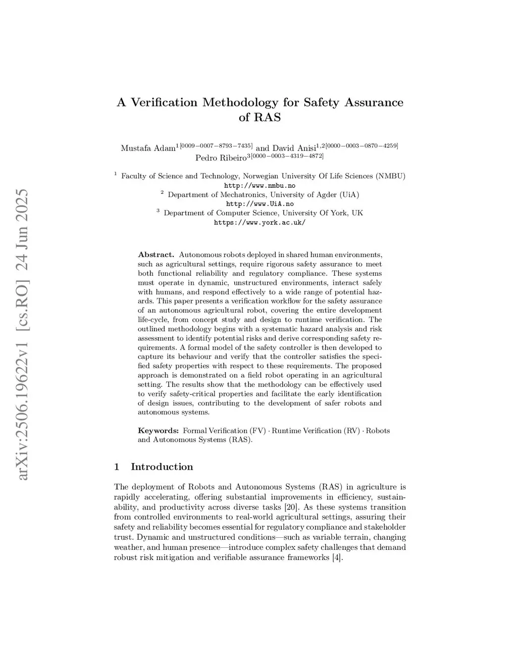 Autonomous robots deployed in shared human environments, such as agricultural settings, require rigorous safety assurance to meet both functional reliability and regulatory compliance. These systems must operate in dynamic, unstructured environments, interact safely with humans, and respond effectively to a wide range of potential hazards. This paper presents a verification workflow for the safety assurance of an autonomous agricultural robot, covering the entire development life-cycle, from concept study and design to runtime verification. The outlined methodology begins with a systematic hazard analysis and risk assessment to identify potential risks and derive corresponding safety requirements. A formal model of the safety controller is then developed to capture its behaviour and verify that the controller satisfies the specified safety properties with respect to these requirements. The proposed approach is demonstrated on a field robot operating in an agricultural setting. The results show that the methodology can be effectively used to verify safety-critical properties and facilitate the early identification of design issues, contributing to the development of safer robots and autonomous systems.