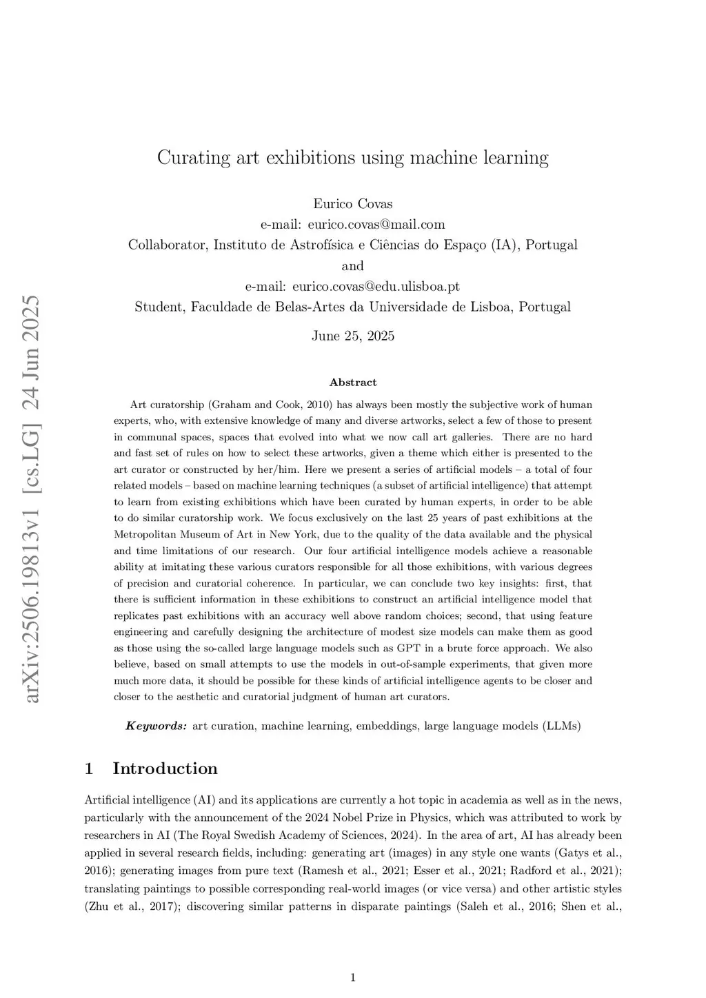 Here we present a series of artificial models - a total of four related models - based on machine learning techniques that attempt to learn from existing exhibitions which have been curated by human experts, in order to be able to do similar curatorship work. Out of our four artificial intelligence models, three achieve a reasonable ability at imitating these various curators responsible for all those exhibitions, with various degrees of precision and curatorial coherence. In particular, we can conclude two key insights: first, that there is sufficient information in these exhibitions to construct an artificial intelligence model that replicates past exhibitions with an accuracy well above random choices; and second, that using feature engineering and carefully designing the architecture of modest size models can make them almost as good as those using the so-called large language models such as GPT in a brute force approach.