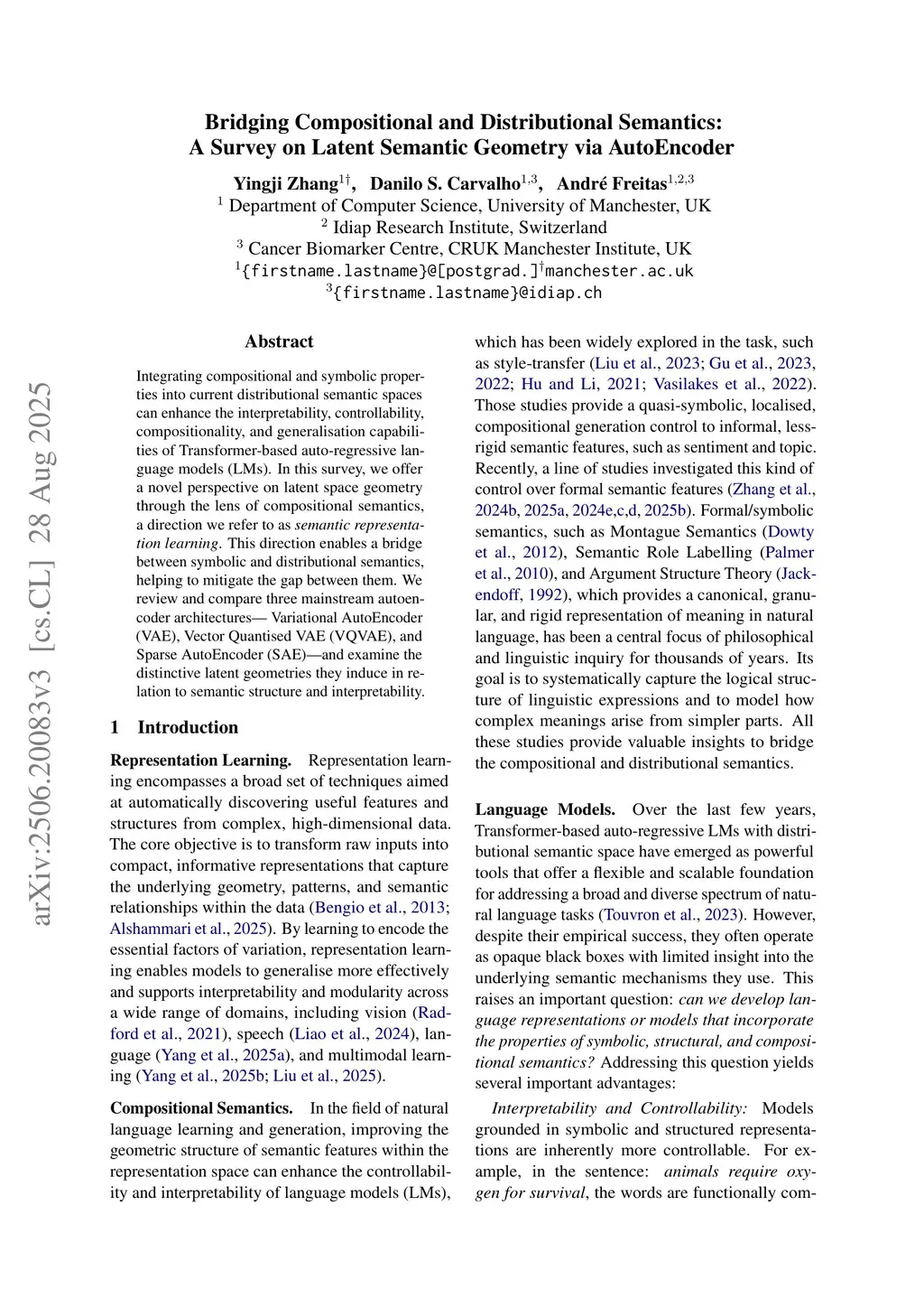 Integrating compositional and symbolic properties into current distributional semantic spaces can enhance the interpretability, controllability, compositionality, and generalisation capabilities of Transformer-based auto-regressive language models (LMs). In this survey, we offer a novel perspective on latent space geometry through the lens of compositional semantics, a direction we refer to as \textit{semantic representation learning}. This direction enables a bridge between symbolic and distributional semantics, helping to mitigate the gap between them. We review and compare three mainstream autoencoder architectures-Variational AutoEncoder (VAE), Vector Quantised VAE (VQVAE), and Sparse AutoEncoder (SAE)-and examine the distinctive latent geometries they induce in relation to semantic structure and interpretability.