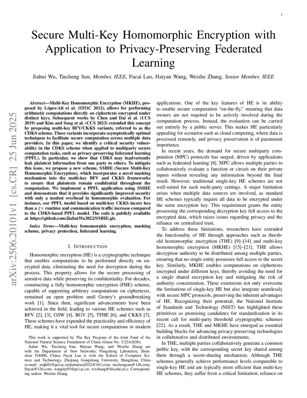Secure Multi-Key Homomorphic Encryption with Application to Privacy-Preserving Federated Learning