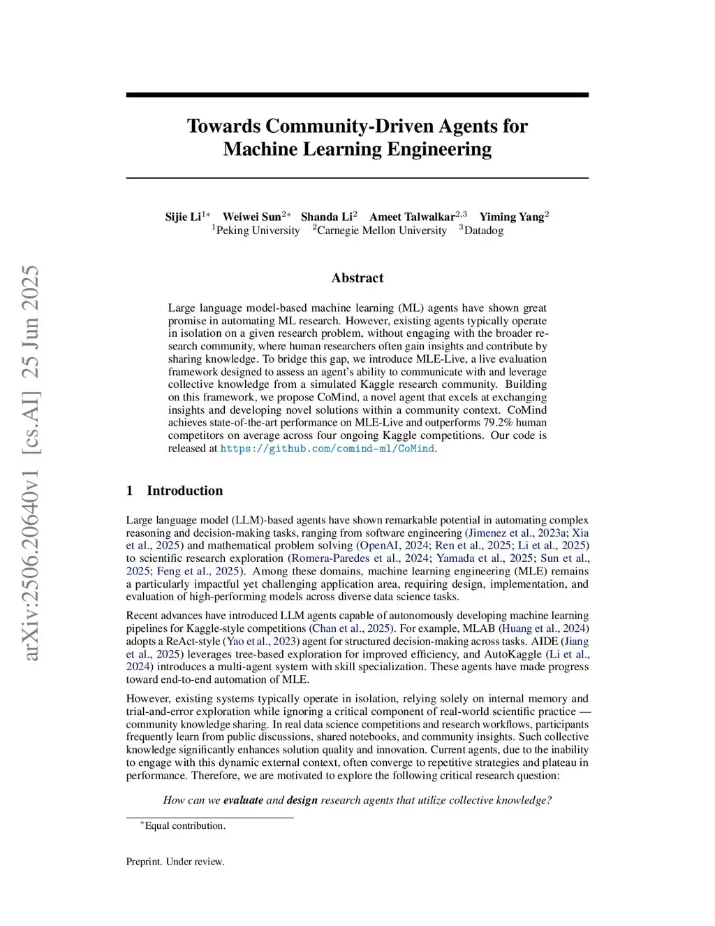 Large language model (LLM) agents show promise in automating machine learning (ML) engineering. However, existing agents typically operate in isolation on a given research problem, without engaging with the broader research community, where human researchers often gain insights and contribute by sharing knowledge. To bridge this gap, we introduce MLE-Live, a live evaluation framework designed to assess an agent's ability to communicate with and leverage collective knowledge from a simulated Kaggle research community. Building on this framework, we propose CoMind, a multi-agent system designed to systematically leverage external knowledge. CoMind employs an iterative parallel exploration mechanism, developing multiple solutions simultaneously to balance exploratory breadth with implementation depth. On 75 past Kaggle competitions within our MLE-Live framework, CoMind achieves a 36% medal rate, establishing a new state of the art. Critically, when deployed in eight live, ongoing competitions, CoMind outperforms 92.6% of human competitors on average, placing in the top 5% on three official leaderboards and the top 1% on one.