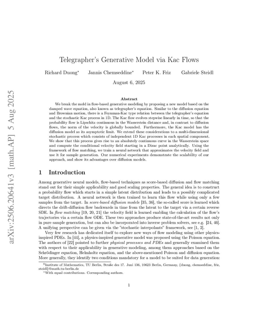 We break the mold in flow-based generative modeling by proposing a new model based on the damped wave equation, also known as telegrapher's equation. Similar to the diffusion equation and Brownian motion, there is a Feynman-Kac type relation between the telegrapher's equation and the stochastic Kac process in 1D. The Kac flow evolves stepwise linearly in time, so that the probability flow is Lipschitz continuous in the Wasserstein distance and, in contrast to diffusion flows, the norm of the velocity is globally bounded. Furthermore, the Kac model has the diffusion model as its asymptotic limit. We extend these considerations to a multi-dimensional stochastic process which consists of independent 1D Kac processes in each spatial component. We show that this process gives rise to an absolutely continuous curve in the Wasserstein space and compute the conditional velocity field starting in a Dirac point analytically. Using the framework of flow matching, we train a neural network that approximates the velocity field and use it for sample generation. Our numerical experiments demonstrate the scalability of our approach, and show its advantages over diffusion models.