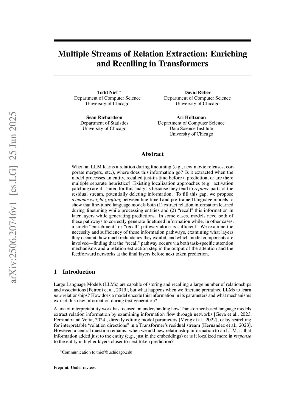 When an LLM learns a new fact during finetuning (e.g., new movie releases, newly elected pope, etc.), where does this information go? Are entities enriched with relation information, or do models recall information just-in-time before a prediction? Or, are ``all of the above'' true with LLMs implementing multiple redundant heuristics? Existing localization approaches (e.g., activation patching) are ill-suited for this analysis because they usually \textit{replace} parts of the residual stream, thus overriding previous information. To fill this gap, we propose \emph{dynamic weight grafting}, a technique that selectively grafts weights from a finetuned model onto a pretrained model. Using this technique, we show two separate pathways for retrieving finetuned relation information: 1) ``enriching" the residual stream with relation information while processing the tokens that correspond to an entity (e.g., ``Zendaya'' in ``Zendaya co-starred with John David Washington'') and 2) ``recalling" this information at the final token position before generating a target fact. In some cases, models need information from both of these pathways to correctly generate finetuned facts while, in other cases, either the ``enrichment" or ``recall" pathway alone is sufficient. We localize the ``recall'' pathway to model components -- finding that ``recall" occurs via both task-specific attention mechanisms and an entity-specific extraction step in the feedforward networks of the final layers before the target prediction. By targeting model components and parameters, as opposed to just activations, we are able to understand the \textit{mechanisms} by which finetuned knowledge is retrieved during generation.
