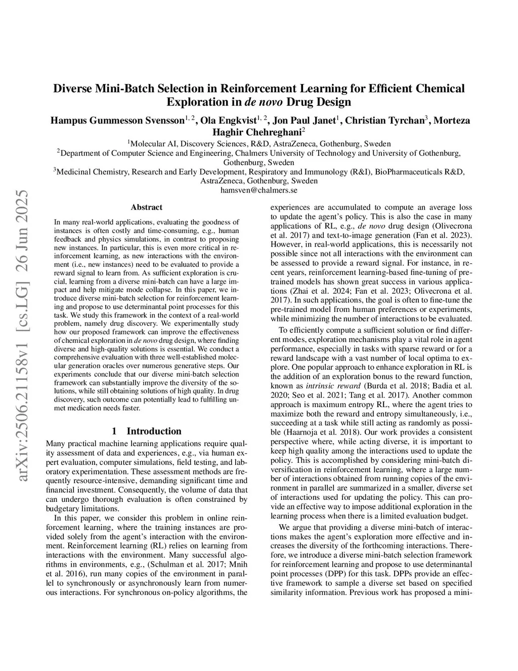 In many real-world applications, evaluating the quality of instances is costly and time-consuming, e.g., human feedback and physics simulations, in contrast to proposing new instances. In particular, this is even more critical in reinforcement learning, since it relies on interactions with the environment (i.e., new instances) that must be evaluated to provide a reward signal for learning. At the same time, performing sufficient exploration is crucial in reinforcement learning to find high-rewarding solutions, meaning that the agent should observe and learn from a diverse set of experiences to find different solutions. Thus, we argue that learning from a diverse mini-batch of experiences can have a large impact on the exploration and help mitigate modethis http URLthis paper, we introduce mini-batch diversification for reinforcement learning and study this framework in the context of a real-world problem, namely, drug discovery. We extensively evaluate how our proposed framework can enhance the effectiveness of chemical exploration in de novo drug design, where finding diverse and high-quality solutions is crucial. Our experiments demonstrate that our proposed diverse mini-batch selection framework can substantially enhance the diversity of solutions while maintaining high-quality solutions. In drug discovery, such an outcome can potentially lead to fulfilling unmet medical needs faster.