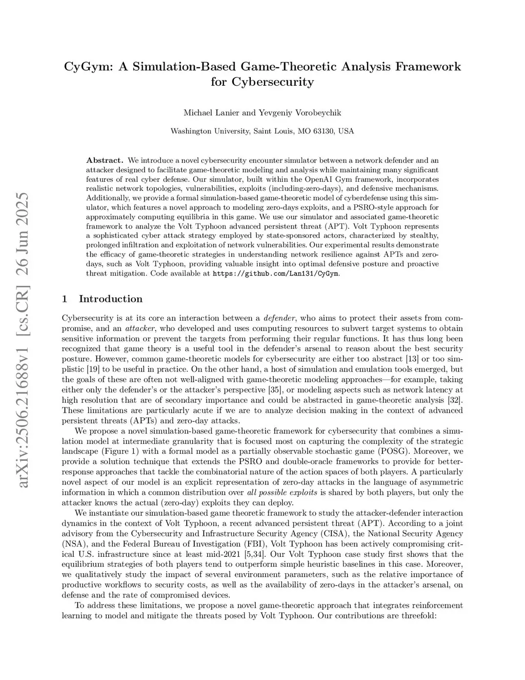 We introduce a novel cybersecurity encounter simulator between a network defender and an attacker designed to facilitate game-theoretic modeling and analysis while maintaining many significant features of real cyber defense. Our simulator, built within the OpenAI Gym framework, incorporates realistic network topologies, vulnerabilities, exploits (including-zero-days), and defensive mechanisms. Additionally, we provide a formal simulation-based game-theoretic model of cyberdefense using this simulator, which features a novel approach to modeling zero-days exploits, and a PSRO-style approach for approximately computing equilibria in this game. We use our simulator and associated game-theoretic framework to analyze the Volt Typhoon advanced persistent threat (APT). Volt Typhoon represents a sophisticated cyber attack strategy employed by state-sponsored actors, characterized by stealthy, prolonged infiltration and exploitation of network vulnerabilities. Our experimental results demonstrate the efficacy of game-theoretic strategies in understanding network resilience against APTs and zero-days, such as Volt Typhoon, providing valuable insight into optimal defensive posture and proactive threat mitigation.