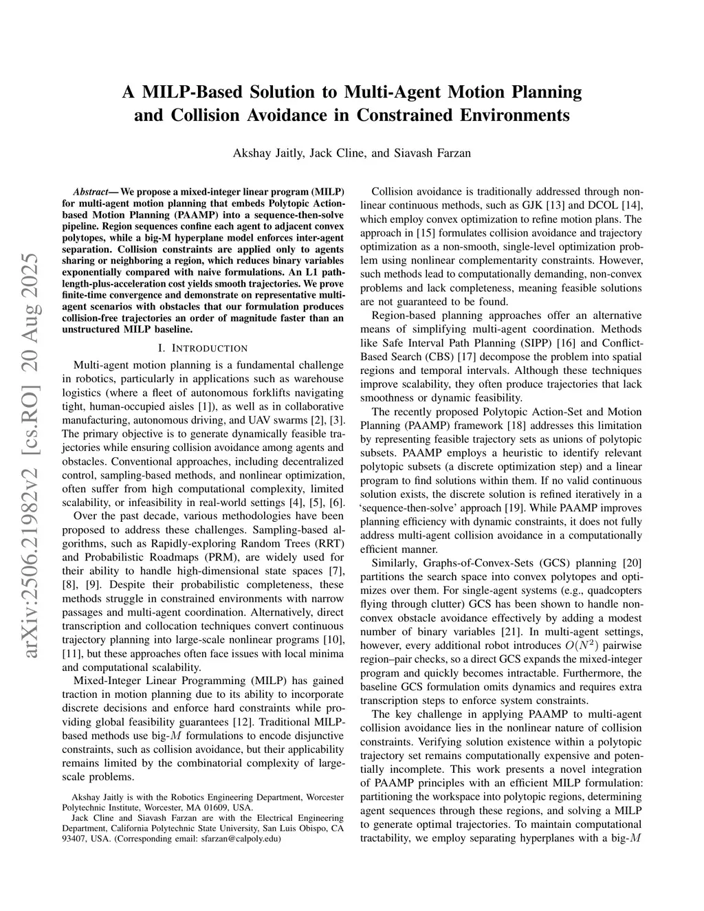 A MILP-Based Solution to Multi-Agent Motion Planning and Collision Avoidance in Constrained Environments