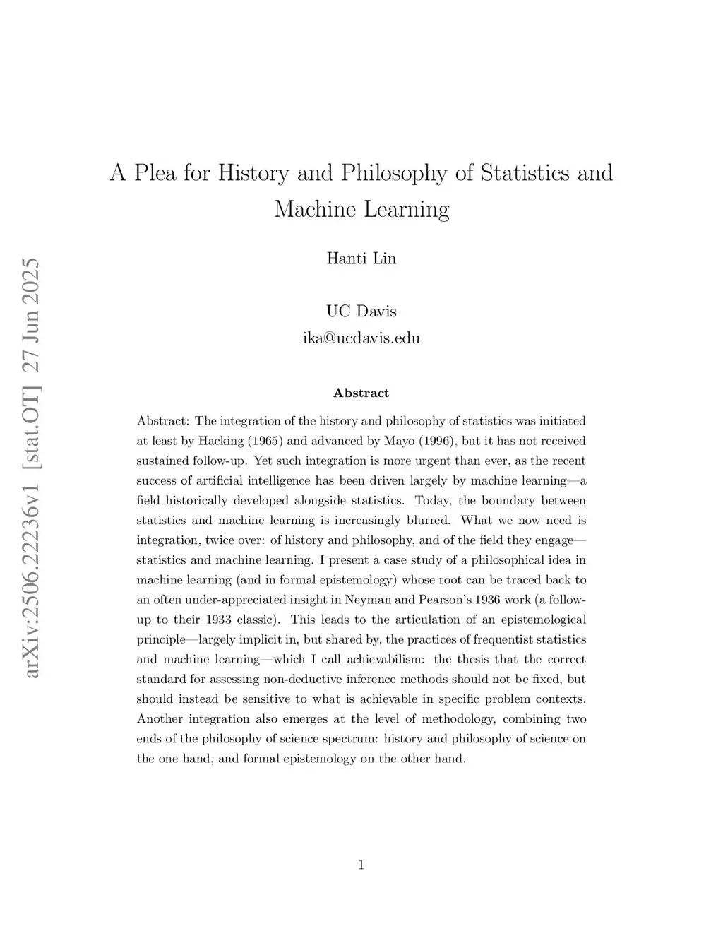 The integration of the history and philosophy of statistics was initiated at least by Hacking (1975) and advanced by Hacking (1990), Mayo (1996), and Zabell (2005), but it has not received sustained follow-up. Yet such integration is more urgent than ever, as the recent success of artificial intelligence has been driven largely by machine learning -- a field historically developed alongside statistics. Today, the boundary between statistics and machine learning is increasingly blurred. What we now need is integration, twice over: of history and philosophy, and of two fields they engage -- statistics and machine learning. I present a case study of a philosophical idea in machine learning (and in formal epistemology) whose root can be traced back to an often under-appreciated insight in Neyman and Pearson's 1936 work (a follow-up to their 1933 classic). This leads to the articulation of an epistemological principle -- largely implicit in, but shared by, the practices of frequentist statistics and machine learning -- which I call achievabilism: the thesis that the correct standard for assessing non-deductive inference methods should not be fixed, but should instead be sensitive to what is achievable in specific problem contexts. Another integration also emerges at the level of methodology, combining two ends of the philosophy of science spectrum: history and philosophy of science on the one hand, and formal epistemology on the other hand.