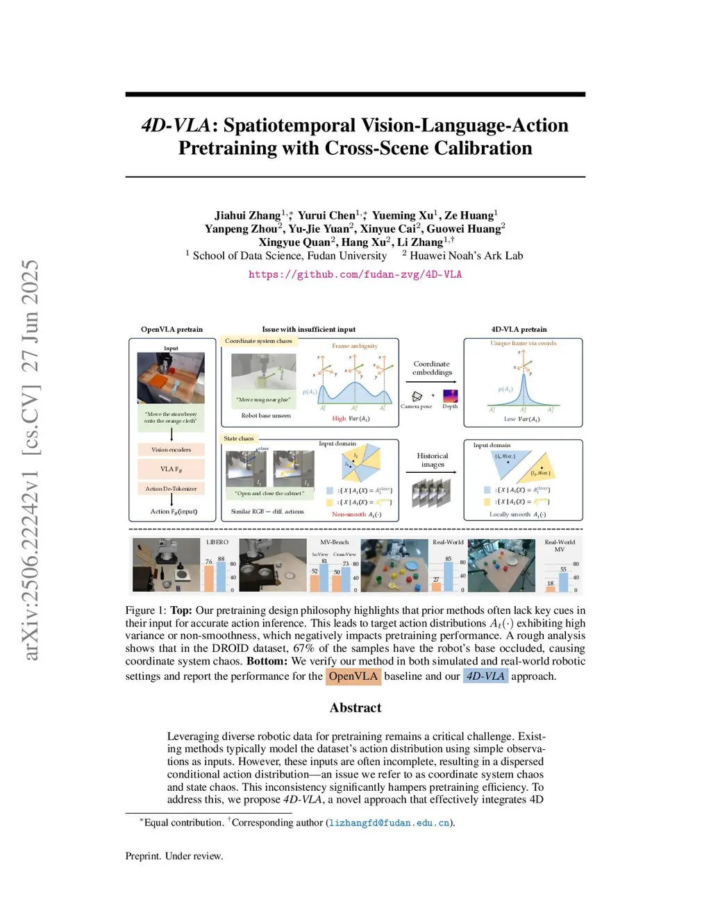 Leveraging diverse robotic data for pretraining remains a critical challenge. Existing methods typically model the dataset's action distribution using simple observations as inputs. However, these inputs are often incomplete, resulting in a dispersed conditional action distribution-an issue we refer to as coordinate system chaos and state chaos. This inconsistency significantly hampers pretraining efficiency. To address this, we propose 4D-VLA, a novel approach that effectively integrates 4D information into the input to mitigate these sources of chaos. Our model introduces depth and temporal information into visual features with sequential RGB-D inputs, aligning the coordinate systems of the robot and the scene. This alignment endows the model with strong spatiotemporal reasoning capabilities while minimizing training overhead. Additionally, we introduce memory bank sampling, a frame sampling strategy designed to extract informative frames from historical images, further improving effectiveness and efficiency. Experimental results demonstrate that our pretraining method and architectural components substantially enhance model performance. In both simulated and real-world experiments, our model achieves a significant increase in success rate over OpenVLA. To further assess spatial perception and generalization to novel views, we introduce MV-Bench, a multi-view simulation benchmark. Our model consistently outperforms existing methods, demonstrating stronger spatial understanding and adaptability.