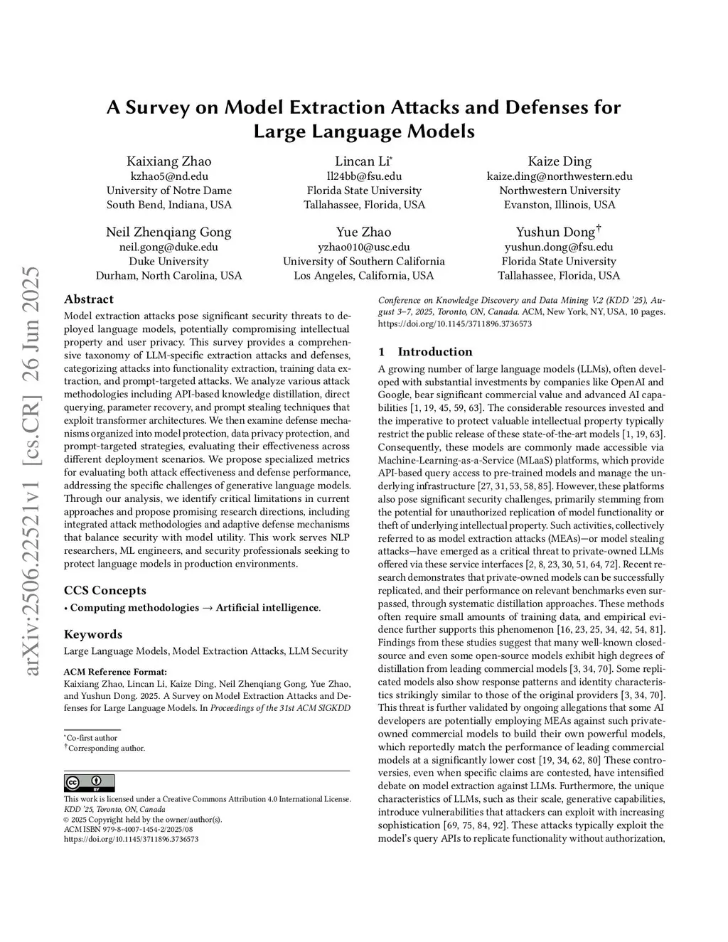 Model extraction attacks pose significant security threats to deployed language models, potentially compromising intellectual property and user privacy. This survey provides a comprehensive taxonomy of LLM-specific extraction attacks and defenses, categorizing attacks into functionality extraction, training data extraction, and prompt-targeted attacks. We analyze various attack methodologies including API-based knowledge distillation, direct querying, parameter recovery, and prompt stealing techniques that exploit transformer architectures. We then examine defense mechanisms organized into model protection, data privacy protection, and prompt-targeted strategies, evaluating their effectiveness across different deployment scenarios. We propose specialized metrics for evaluating both attack effectiveness and defense performance, addressing the specific challenges of generative language models. Through our analysis, we identify critical limitations in current approaches and propose promising research directions, including integrated attack methodologies and adaptive defense mechanisms that balance security with model utility. This work serves NLP researchers, ML engineers, and security professionals seeking to protect language models in production environments.