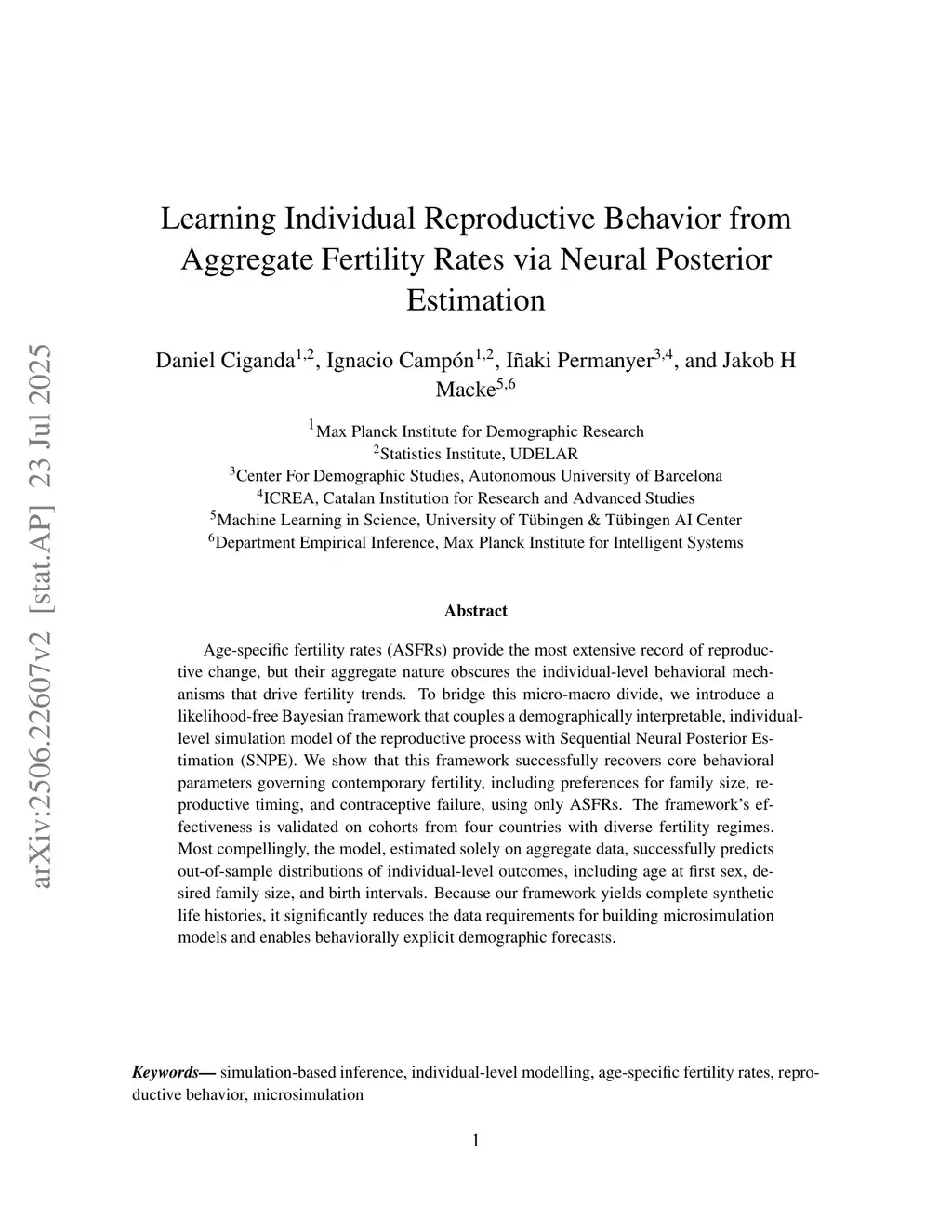 Age-specific fertility rates (ASFRs) provide the most extensive record of reproductive change, but their aggregate nature obscures the individual-level behavioral mechanisms that drive fertility trends. To bridge this micro-macro divide, we introduce a likelihood-free Bayesian framework that couples a demographically interpretable, individual-level simulation model of the reproductive process with Sequential Neural Posterior Estimation (SNPE). We show that this framework successfully recovers core behavioral parameters governing contemporary fertility, including preferences for family size, reproductive timing, and contraceptive failure, using only ASFRs. The framework's effectiveness is validated on cohorts from four countries with diverse fertility regimes. Most compellingly, the model, estimated solely on aggregate data, successfully predicts out-of-sample distributions of individual-level outcomes, including age at first sex, desired family size, and birth intervals. Because our framework yields complete synthetic life histories, it significantly reduces the data requirements for building microsimulation models and enables behaviorally explicit demographic forecasts.