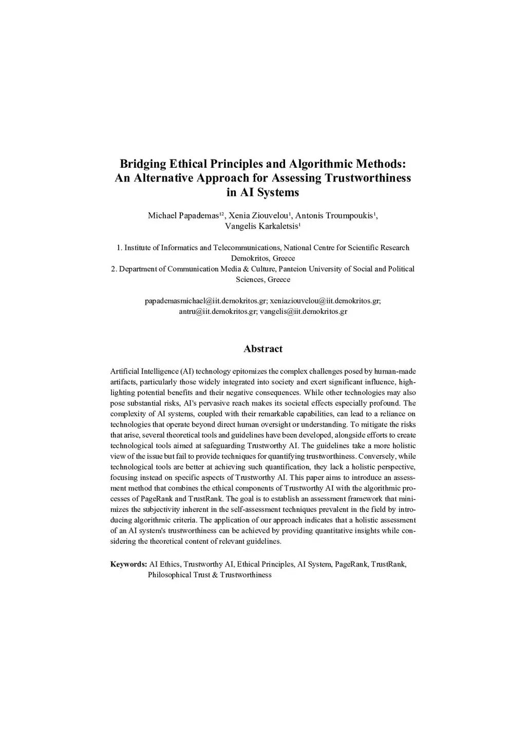 Bridging Ethical Principles and Algorithmic Methods: An Alternative Approach for Assessing Trustworthiness in AI Systems