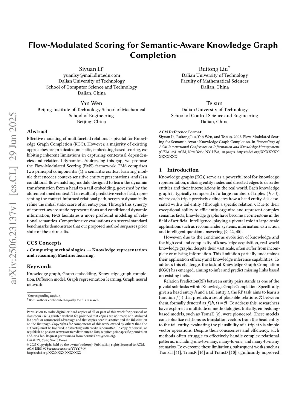 Effective modeling of multifaceted relations is pivotal for Knowledge Graph Completion (KGC). However, a majority of existing approaches are predicated on static, embedding-based scoring, exhibiting inherent limitations in capturing contextual dependencies and relational dynamics. Addressing this gap, we propose the Flow-Modulated Scoring (FMS) framework. FMS comprises two principal components: (1) a semantic context learning module that encodes context-sensitive entity representations, and (2) a conditional flow-matching module designed to learn the dynamic transformation from a head to a tail embedding, governed by the aforementioned context. The resultant predictive vector field, representing the context-informed relational path, serves to dynamically refine the initial static score of an entity pair. Through this synergy of context-aware static representations and conditioned dynamic information, FMS facilitates a more profound modeling of relational semantics. Comprehensive evaluations on several standard benchmarks demonstrate that our proposed method surpasses prior state-of-the-art results.