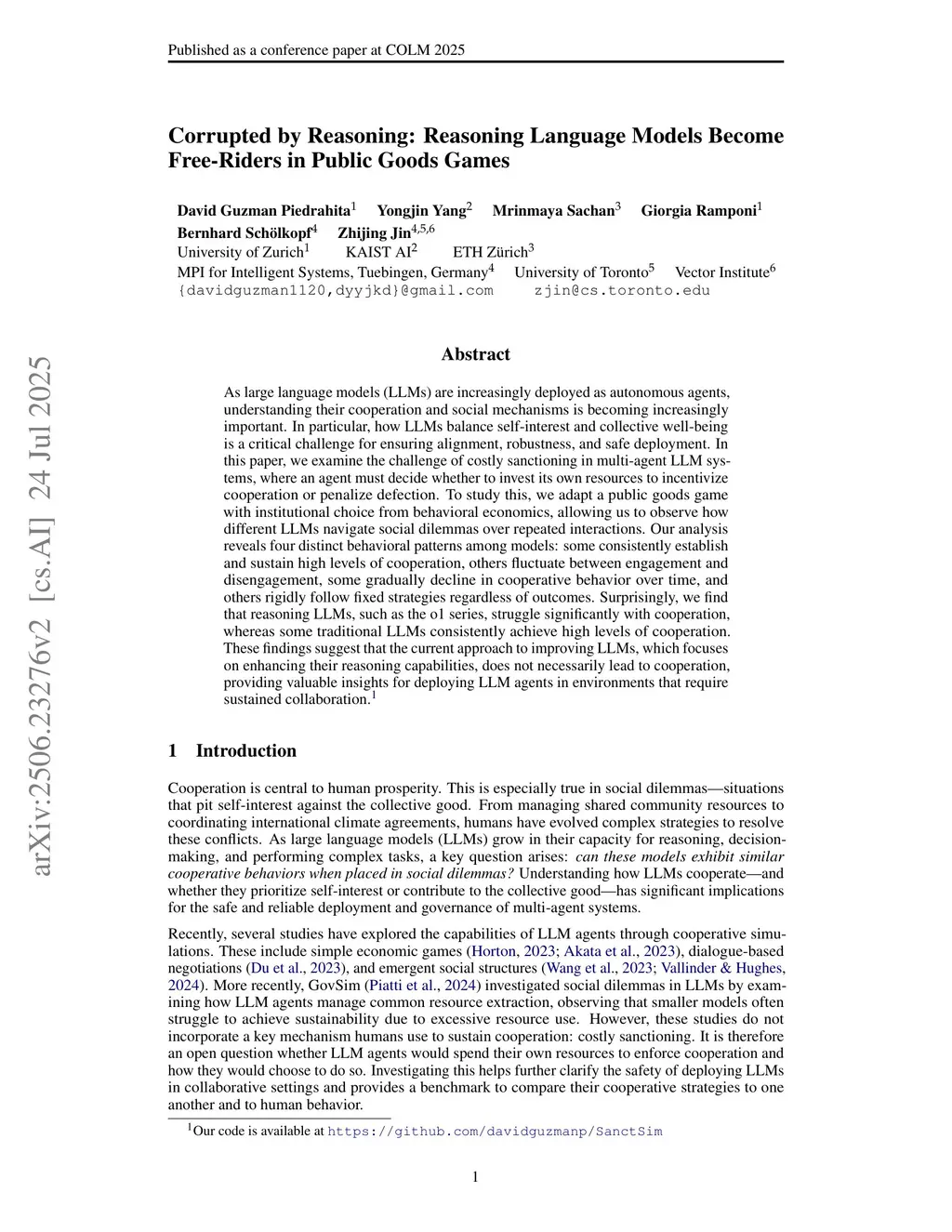 As large language models (LLMs) are increasingly deployed as autonomous agents, understanding their cooperation and social mechanisms is becoming increasingly important. In particular, how LLMs balance self-interest and collective well-being is a critical challenge for ensuring alignment, robustness, and safe deployment. In this paper, we examine the challenge of costly sanctioning in multi-agent LLM systems, where an agent must decide whether to invest its own resources to incentivize cooperation or penalize defection. To study this, we adapt a public goods game with institutional choice from behavioral economics, allowing us to observe how different LLMs navigate social dilemmas over repeated interactions. Our analysis reveals four distinct behavioral patterns among models: some consistently establish and sustain high levels of cooperation, others fluctuate between engagement and disengagement, some gradually decline in cooperative behavior over time, and others rigidly follow fixed strategies regardless of outcomes. Surprisingly, we find that reasoning LLMs, such as the o1 series, struggle significantly with cooperation, whereas some traditional LLMs consistently achieve high levels of cooperation. These findings suggest that the current approach to improving LLMs, which focuses on enhancing their reasoning capabilities, does not necessarily lead to cooperation, providing valuable insights for deploying LLM agents in environments that require sustained collaboration. Our code is available atthis https URL
