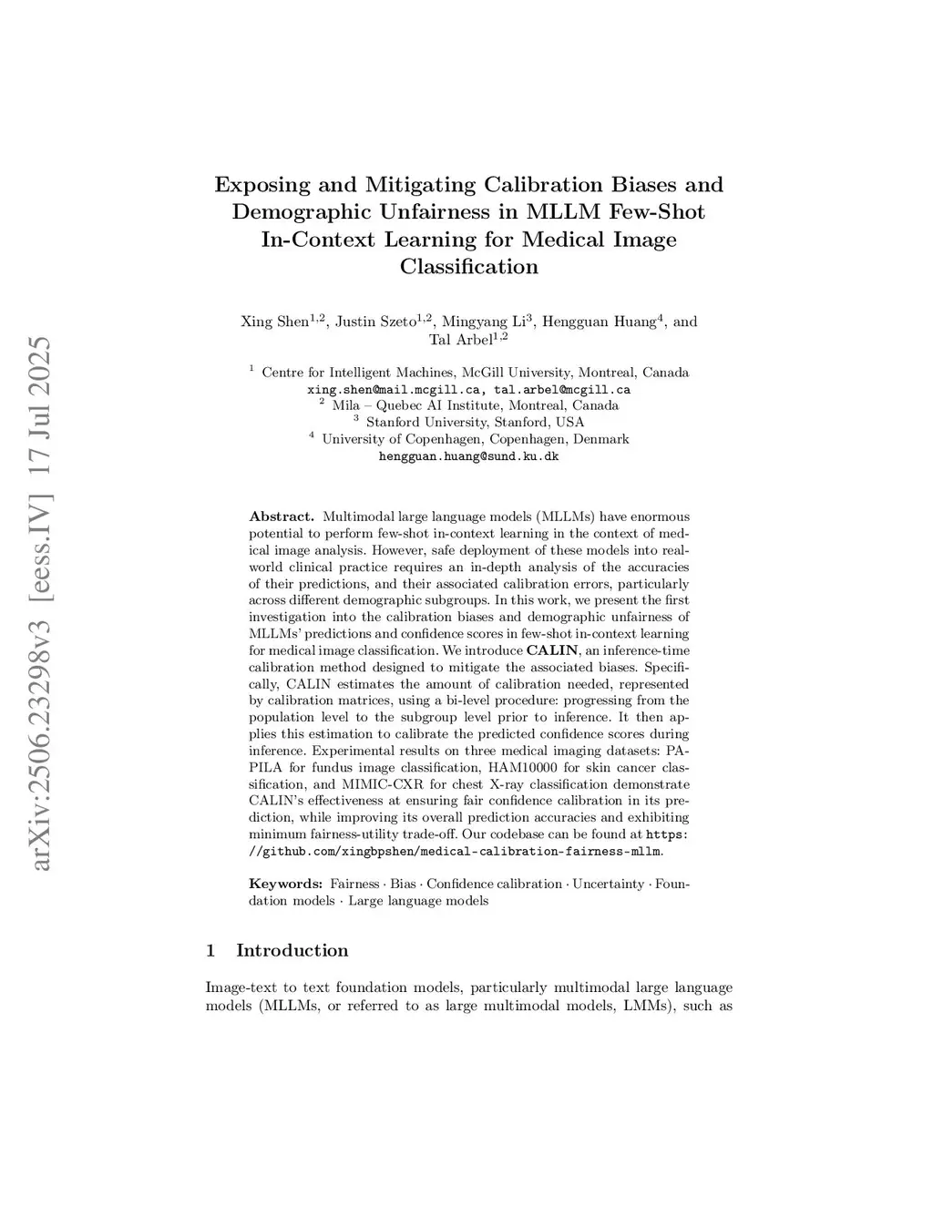 Multimodal large language models (MLLMs) have enormous potential to perform few-shot in-context learning in the context of medical image analysis. However, safe deployment of these models into real-world clinical practice requires an in-depth analysis of the accuracies of their predictions, and their associated calibration errors, particularly across different demographic subgroups. In this work, we present the first investigation into the calibration biases and demographic unfairness of MLLMs' predictions and confidence scores in few-shot in-context learning for medical image classification. We introduce CALIN, an inference-time calibration method designed to mitigate the associated biases. Specifically, CALIN estimates the amount of calibration needed, represented by calibration matrices, using a bi-level procedure: progressing from the population level to the subgroup level prior to inference. It then applies this estimation to calibrate the predicted confidence scores during inference. Experimental results on three medical imaging datasets: PAPILA for fundus image classification, HAM10000 for skin cancer classification, and MIMIC-CXR for chest X-ray classification demonstrate CALIN's effectiveness at ensuring fair confidence calibration in its prediction, while improving its overall prediction accuracies and exhibiting minimum fairness-utility trade-off. Our codebase can be found atthis https URL.