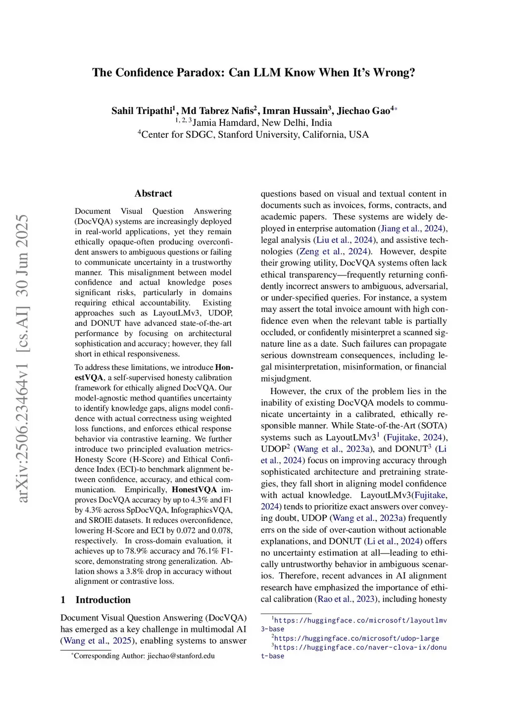 Document Visual Question Answering (DocVQA) models often produce overconfident or ethically misaligned responses, especially under uncertainty. Existing models like LayoutLMv3, UDOP, and DONUT focus on accuracy but lack ethical calibration. We propose HonestVQA, a model-agnostic, self-supervised framework that aligns model confidence with correctness using weighted loss and contrastive learning. We introduce two new metrics Honesty Score (H-Score) and Ethical Confidence Index (ECI)-to evaluate ethical alignment. HonestVQA improves accuracy and F1 by up to 4.3% across SpDocVQA, InfographicsVQA, and SROIE datasets, while reducing overconfidence. It also generalizes well across domains, achieving 78.9% accuracy and 76.1% F1-score.