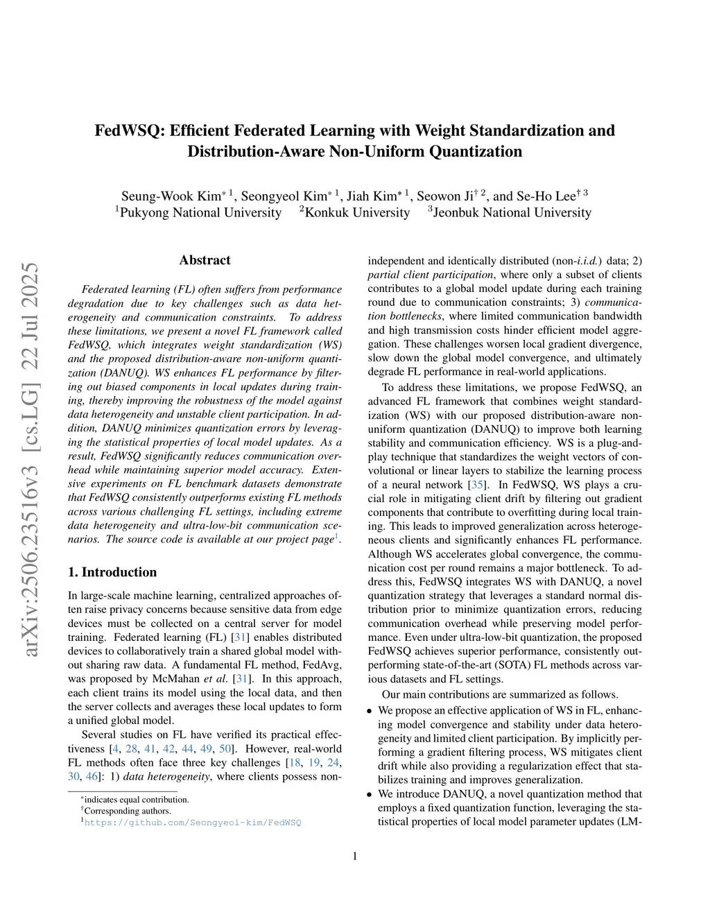 Federated learning (FL) often suffers from performance degradation due to key challenges such as data heterogeneity and communication constraints. To address these limitations, we present a novel FL framework called FedWSQ, which integrates weight standardization (WS) and the proposed distribution-aware non-uniform quantization (DANUQ). WS enhances FL performance by filtering out biased components in local updates during training, thereby improving the robustness of the model against data heterogeneity and unstable client participation. In addition, DANUQ minimizes quantization errors by leveraging the statistical properties of local model updates. As a result, FedWSQ significantly reduces communication overhead while maintaining superior model accuracy. Extensive experiments on FL benchmark datasets demonstrate that FedWSQ consistently outperforms existing FL methods across various challenging FL settings, including extreme data heterogeneity and ultra-low-bit communication scenarios.