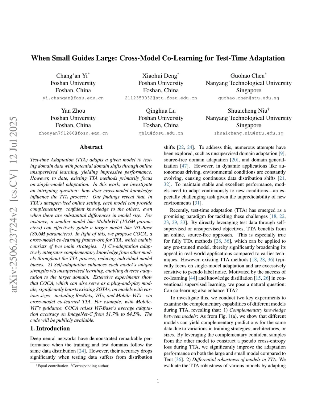 When Small Guides Large: Cross-Model Co-Learning for Test-Time Adaptation