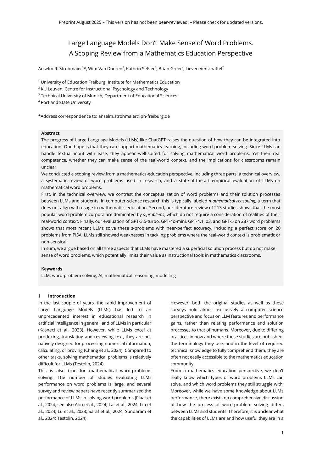 Large Language Models Don't Make Sense of Word Problems. A Scoping Review from a Mathematics Education Perspective