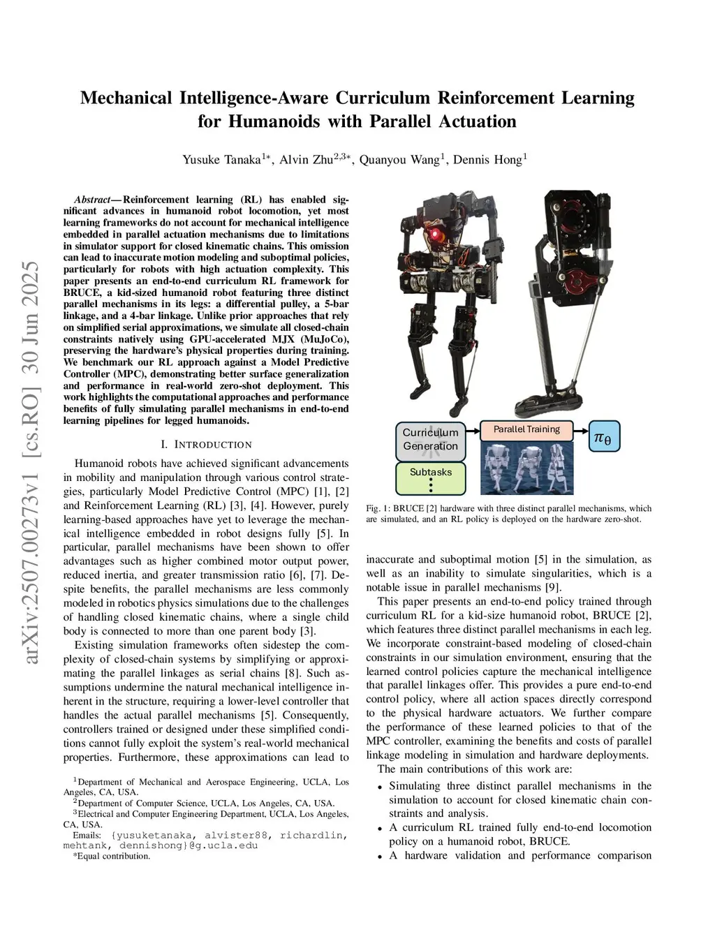 Mechanical Intelligence-Aware Curriculum Reinforcement Learning for Humanoids with Parallel Actuation
