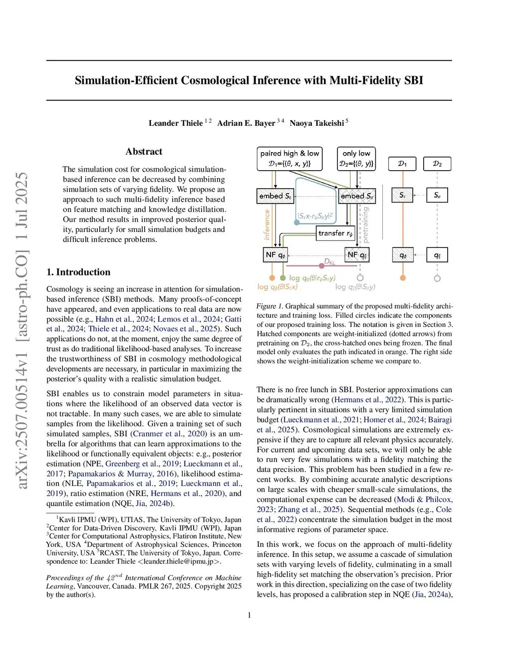 The simulation cost for cosmological simulation-based inference can be decreased by combining simulation sets of varying fidelity. We propose an approach to such multi-fidelity inference based on feature matching and knowledge distillation. Our method results in improved posterior quality, particularly for small simulation budgets and difficult inference problems.