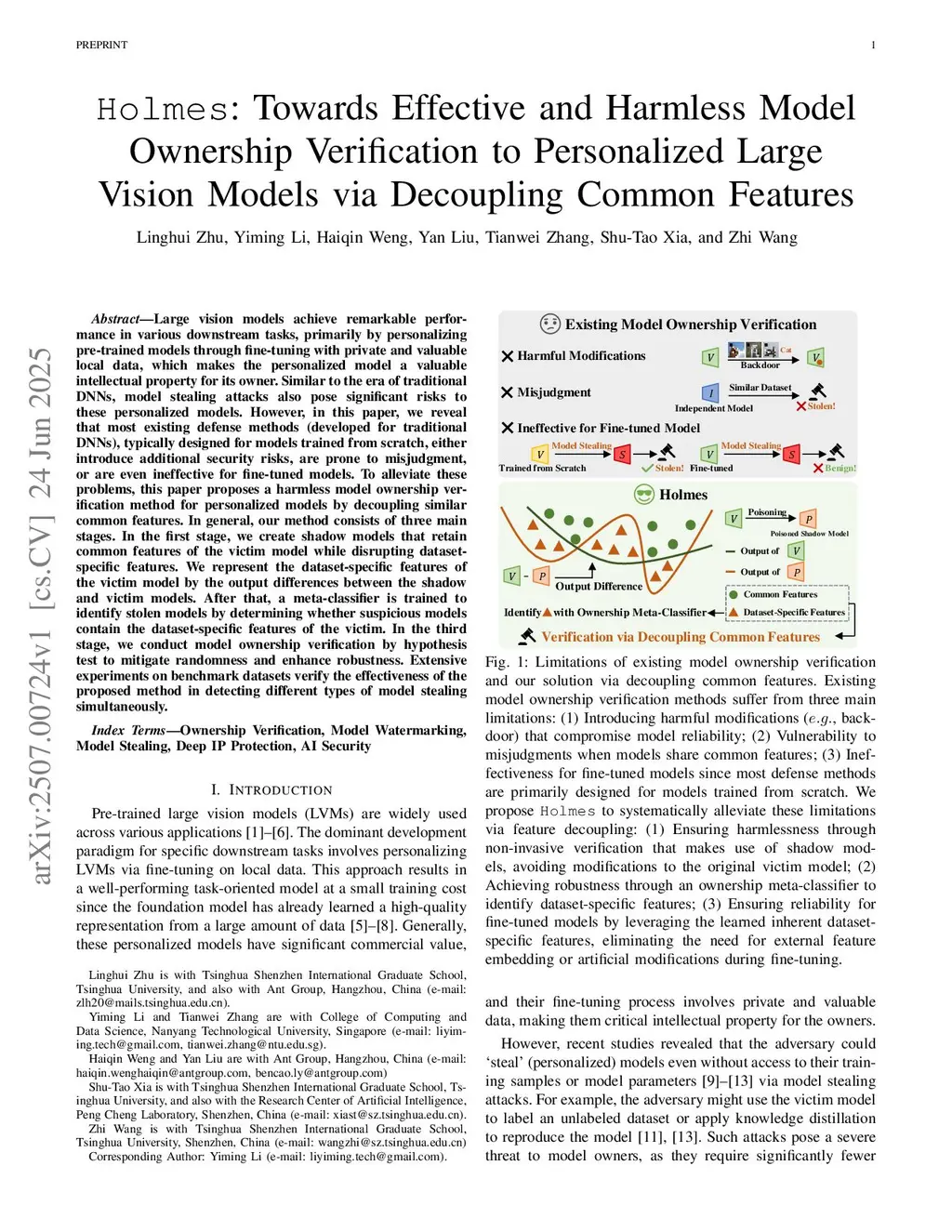 Holmes: Towards Effective and Harmless Model Ownership Verification to Personalized Large Vision Models via Decoupling Common Features