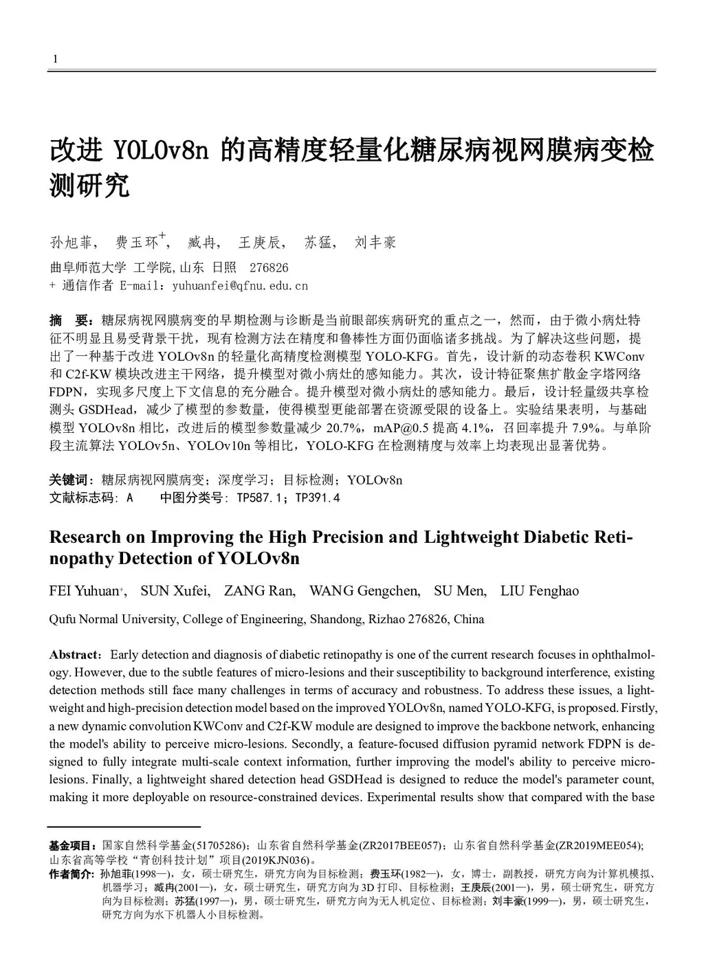 Early detection and diagnosis of diabetic retinopathy is one of the current research focuses in ophthalmology. However, due to the subtle features of micro-lesions and their susceptibility to background interference, ex-isting detection methods still face many challenges in terms of accuracy and robustness. To address these issues, a lightweight and high-precision detection model based on the improved YOLOv8n, named YOLO-KFG, is proposed. Firstly, a new dynamic convolution KWConv and C2f-KW module are designed to improve the backbone network, enhancing the model's ability to perceive micro-lesions. Secondly, a fea-ture-focused diffusion pyramid network FDPN is designed to fully integrate multi-scale context information, further improving the model's ability to perceive micro-lesions. Finally, a lightweight shared detection head GSDHead is designed to reduce the model's parameter count, making it more deployable on re-source-constrained devices. Experimental results show that compared with the base model YOLOv8n, the improved model reduces the parameter count by 20.7%, increases mAP@0.5 by 4.1%, and improves the recall rate by 7.9%. Compared with single-stage mainstream algorithms such as YOLOv5n and YOLOv10n, YOLO-KFG demonstrates significant advantages in both detection accuracy and efficiency.