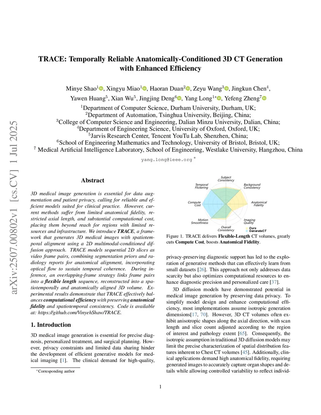 TRACE: Temporally Reliable Anatomically-Conditioned 3D CT Generation with Enhanced Efficiency