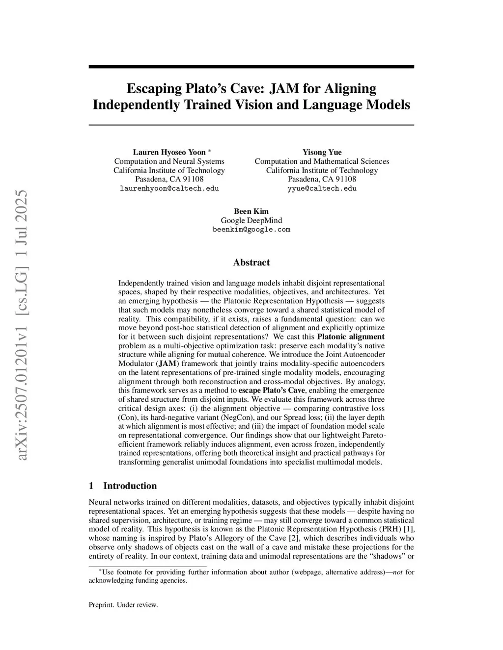 Escaping Platos Cave: JAM for Aligning Independently Trained Vision and Language Models