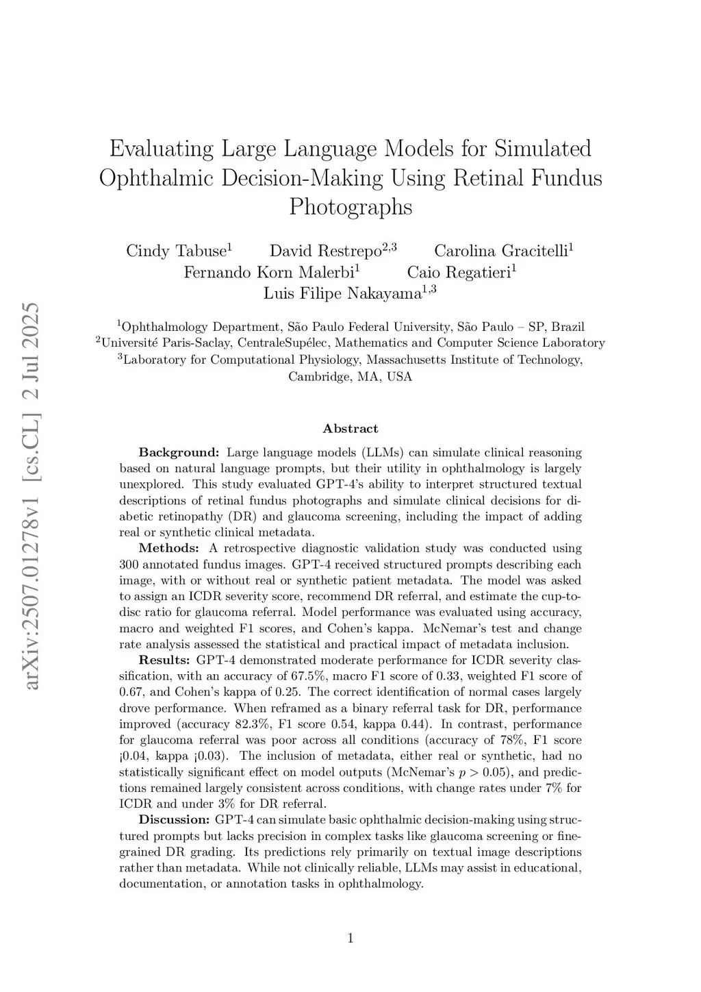 Large language models (LLMs) can simulate clinical reasoning based on natural language prompts, but their utility in ophthalmology is largely unexplored. This study evaluated GPT-4's ability to interpret structured textual descriptions of retinal fundus photographs and simulate clinical decisions for diabetic retinopathy (DR) and glaucoma screening, including the impact of adding real or synthetic clinical metadata. We conducted a retrospective diagnostic validation study using 300 annotated fundus images. GPT-4 received structured prompts describing each image, with or without patient metadata. The model was tasked with assigning an ICDR severity score, recommending DR referral, and estimating the cup-to-disc ratio for glaucoma referral. Performance was evaluated using accuracy, macro and weighted F1 scores, and Cohen's kappa. McNemar's test and change rate analysis were used to assess the influence of metadata. GPT-4 showed moderate performance for ICDR classification (accuracy 67.5%, macro F1 0.33, weighted F1 0.67, kappa 0.25), driven mainly by correct identification of normal cases. Performance improved in the binary DR referral task (accuracy 82.3%, F1 0.54, kappa 0.44). For glaucoma referral, performance was poor across all settings (accuracy ~78%, F1 <0.04, kappa <0.03). Metadata inclusion did not significantly affect outcomes (McNemar p > 0.05), and predictions remained consistent across conditions. GPT-4 can simulate basic ophthalmic decision-making from structured prompts but lacks precision for complex tasks. While not suitable for clinical use, LLMs may assist in education, documentation, or image annotation workflows in ophthalmology.