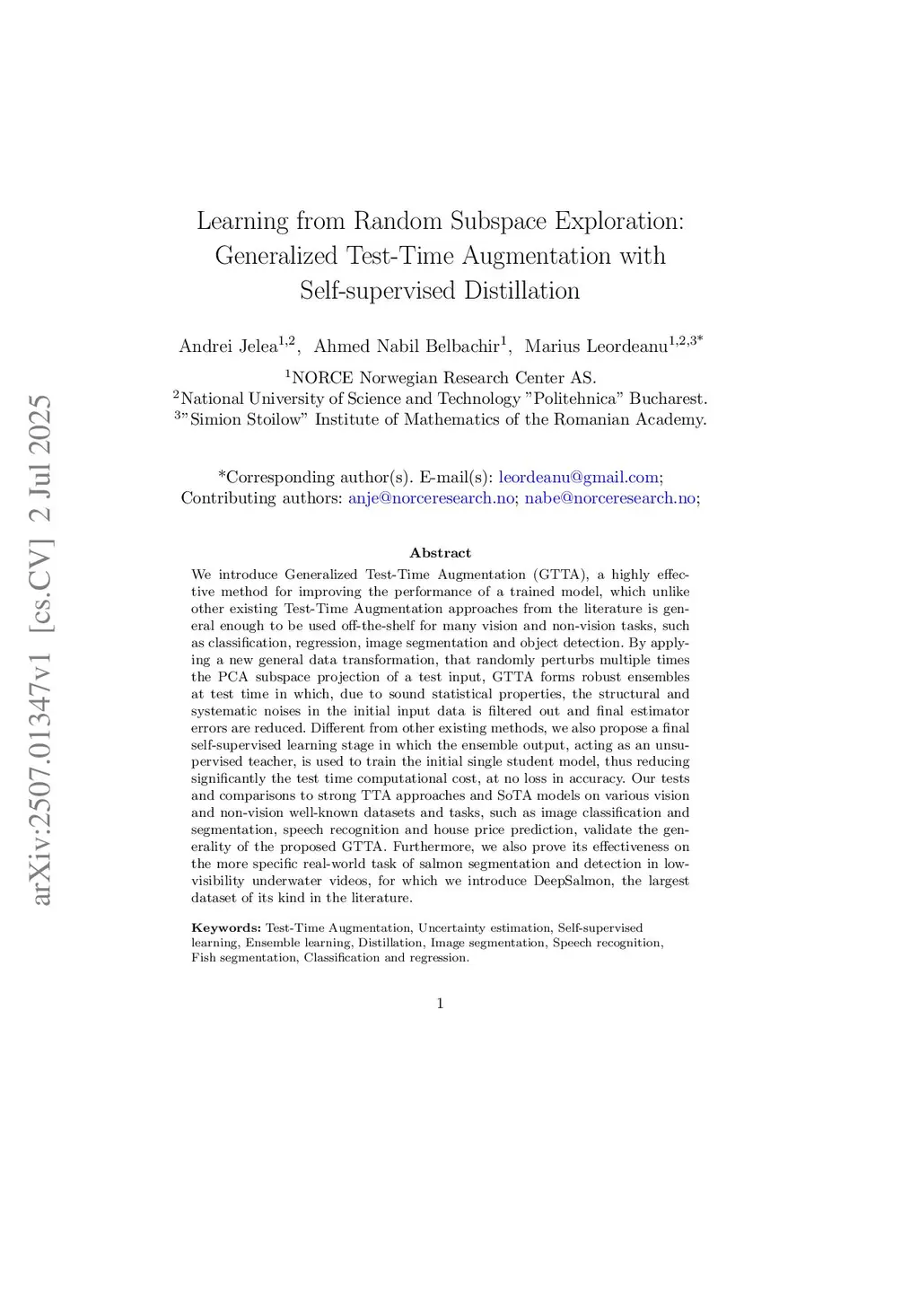 We introduce Generalized Test-Time Augmentation (GTTA), a highly effective method for improving the performance of a trained model, which unlike other existing Test-Time Augmentation approaches from the literature is general enough to be used off-the-shelf for many vision and non-vision tasks, such as classification, regression, image segmentation and object detection. By applying a new general data transformation, that randomly perturbs multiple times the PCA subspace projection of a test input, GTTA creates valid augmented samples from the data distribution with high diversity, properties we theoretically show that are essential for a Test-Time Augmentation method to be effective. Different from other existing methods, we also propose a final self-supervised learning stage in which the ensemble output, acting as an unsupervised teacher, is used to train the initial single student model, thus reducing significantly the test time computational cost. Our comparisons to strong TTA approaches and SoTA models on various vision and non-vision well-known datasets and tasks, such as image classification and segmentation, pneumonia detection, speech recognition and house price prediction, validate the generality of the proposed GTTA. Furthermore, we also prove its effectiveness on the more specific real-world task of salmon segmentation and detection in low-visibility underwater videos, for which we introduce DeepSalmon, the largest dataset of its kind in the literature.