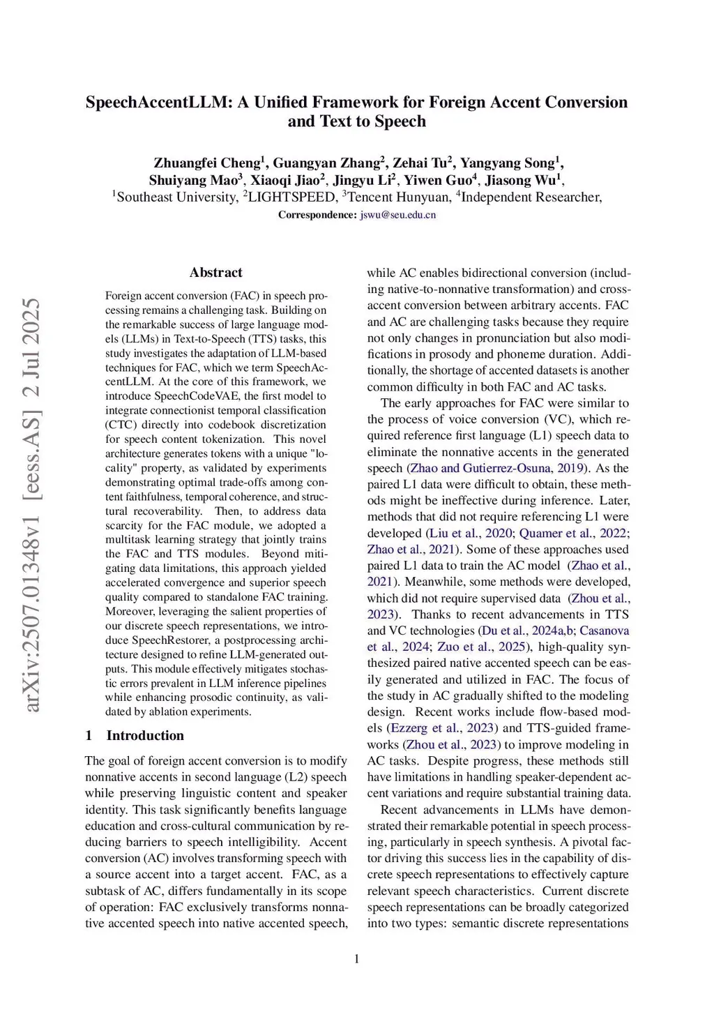 Foreign accent conversion (FAC) in speech processing remains a challenging task. Building on the remarkable success of large language models (LLMs) in Text-to-Speech (TTS) tasks, this study investigates the adaptation of LLM-based techniques for FAC, which we term SpeechAccentLLM. At the core of this framework, we introduce SpeechCodeVAE, the first model to integrate connectionist temporal classification (CTC) directly into codebook discretization for speech content tokenization. This novel architecture generates tokens with a unique "locality" property, as validated by experiments demonstrating optimal trade-offs among content faithfulness, temporal coherence, and structural recoverability. Then, to address data scarcity for the FAC module, we adopted a multitask learning strategy that jointly trains the FAC and TTS modules. Beyond mitigating data limitations, this approach yielded accelerated convergence and superior speech quality compared to standalone FAC training. Moreover, leveraging the salient properties of our discrete speech representations, we introduce SpeechRestorer, a postprocessing architecture designed to refine LLM-generated outputs. This module effectively mitigates stochastic errors prevalent in LLM inference pipelines while enhancing prosodic continuity, as validated by ablation experiments.