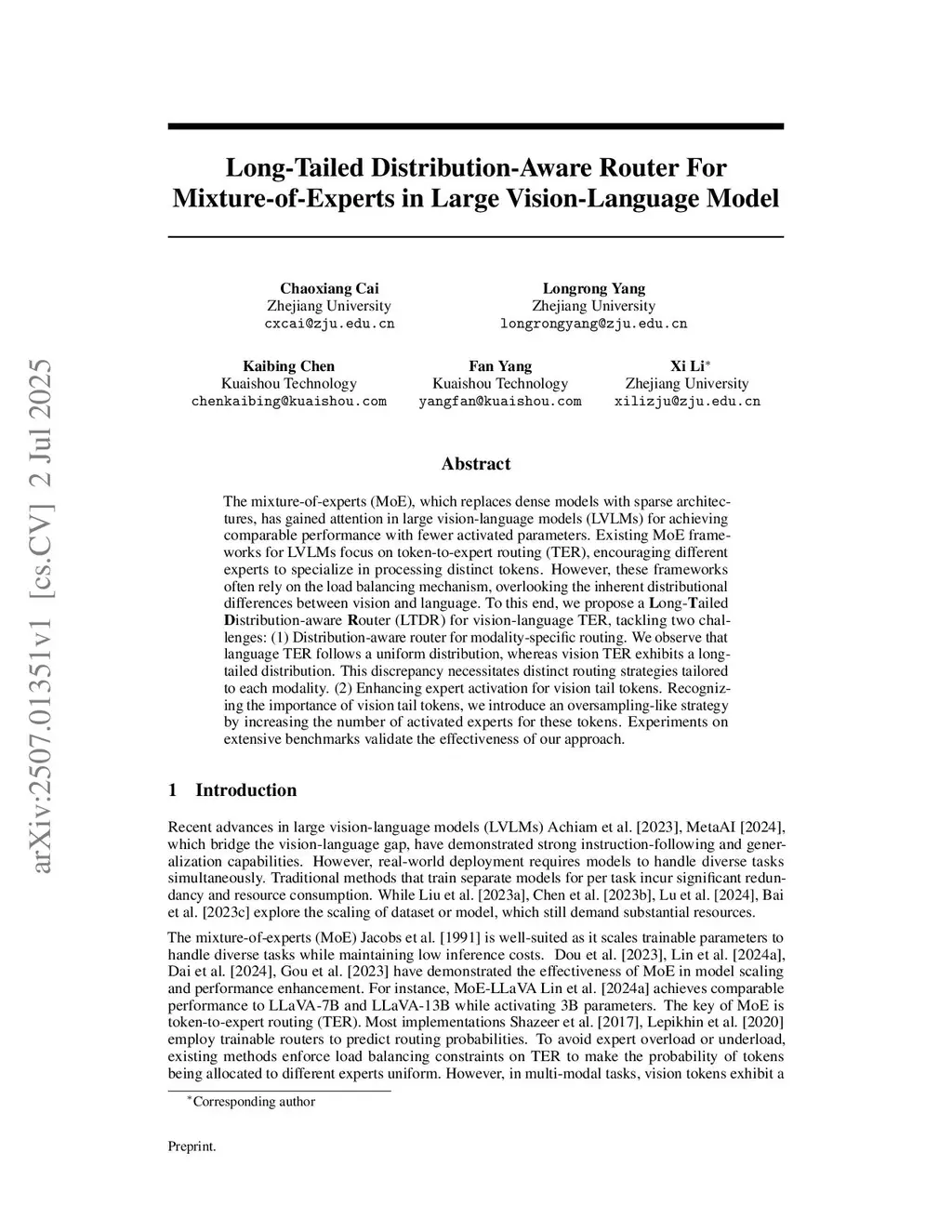 The mixture-of-experts (MoE), which replaces dense models with sparse architectures, has gained attention in large vision-language models (LVLMs) for achieving comparable performance with fewer activated parameters. Existing MoE frameworks for LVLMs focus on token-to-expert routing (TER), encouraging different experts to specialize in processing distinct tokens. However, these frameworks often rely on the load balancing mechanism, overlooking the inherent distributional differences between vision and language. To this end, we propose a Long-Tailed Distribution-aware Router (LTDR) for vision-language TER, tackling two challenges: (1) Distribution-aware router for modality-specific routing. We observe that language TER follows a uniform distribution, whereas vision TER exhibits a long-tailed distribution. This discrepancy necessitates distinct routing strategies tailored to each modality. (2) Enhancing expert activation for vision tail tokens. Recognizing the importance of vision tail tokens, we introduce an oversampling-like strategy by increasing the number of activated experts for these tokens. Experiments on extensive benchmarks validate the effectiveness of our approach.