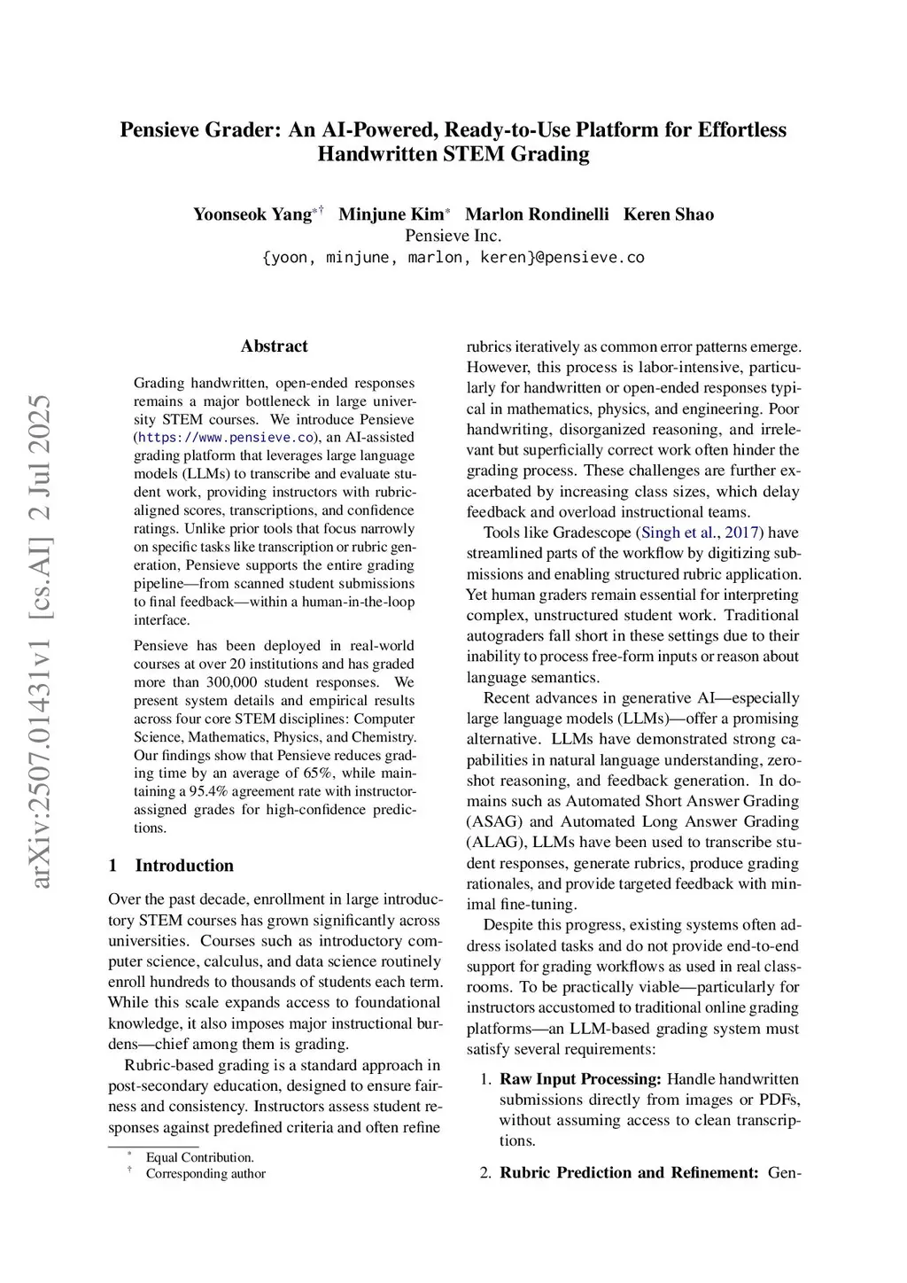 Grading handwritten, open-ended responses remains a major bottleneck in large university STEM courses. We introduce Pensieve (this https URL), an AI-assisted grading platform that leverages large language models (LLMs) to transcribe and evaluate student work, providing instructors with rubric-aligned scores, transcriptions, and confidence ratings. Unlike prior tools that focus narrowly on specific tasks like transcription or rubric generation, Pensieve supports the entire grading pipeline-from scanned student submissions to final feedback-within a human-in-the-loop interface.Pensieve has been deployed in real-world courses at over 20 institutions and has graded more than 300,000 student responses. We present system details and empirical results across four core STEM disciplines: Computer Science, Mathematics, Physics, and Chemistry. Our findings show that Pensieve reduces grading time by an average of 65%, while maintaining a 95.4% agreement rate with instructor-assigned grades for high-confidence predictions.