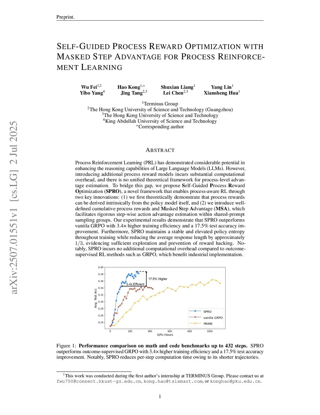 Process Reinforcement Learning~(PRL) has demonstrated considerable potential in enhancing the reasoning capabilities of Large Language Models~(LLMs). However, introducing additional process reward models incurs substantial computational overhead, and there is no unified theoretical framework for process-level advantage estimation. To bridge this gap, we propose \textbf{S}elf-Guided \textbf{P}rocess \textbf{R}eward \textbf{O}ptimization~(\textbf{SPRO}), a novel framework that enables process-aware RL through two key innovations: (1) we first theoretically demonstrate that process rewards can be derived intrinsically from the policy model itself, and (2) we introduce well-defined cumulative process rewards and \textbf{M}asked \textbf{S}tep \textbf{A}dvantage (\textbf{MSA}), which facilitates rigorous step-wise action advantage estimation within shared-prompt sampling groups. Our experimental results demonstrate that SPRO outperforms vaniila GRPO with 3.4x higher training efficiency and a 17.5\% test accuracy improvement. Furthermore, SPRO maintains a stable and elevated policy entropy throughout training while reducing the average response length by approximately , evidencing sufficient exploration and prevention of reward hacking. Notably, SPRO incurs no additional computational overhead compared to outcome-supervised RL methods such as GRPO, which benefit industrial implementation.