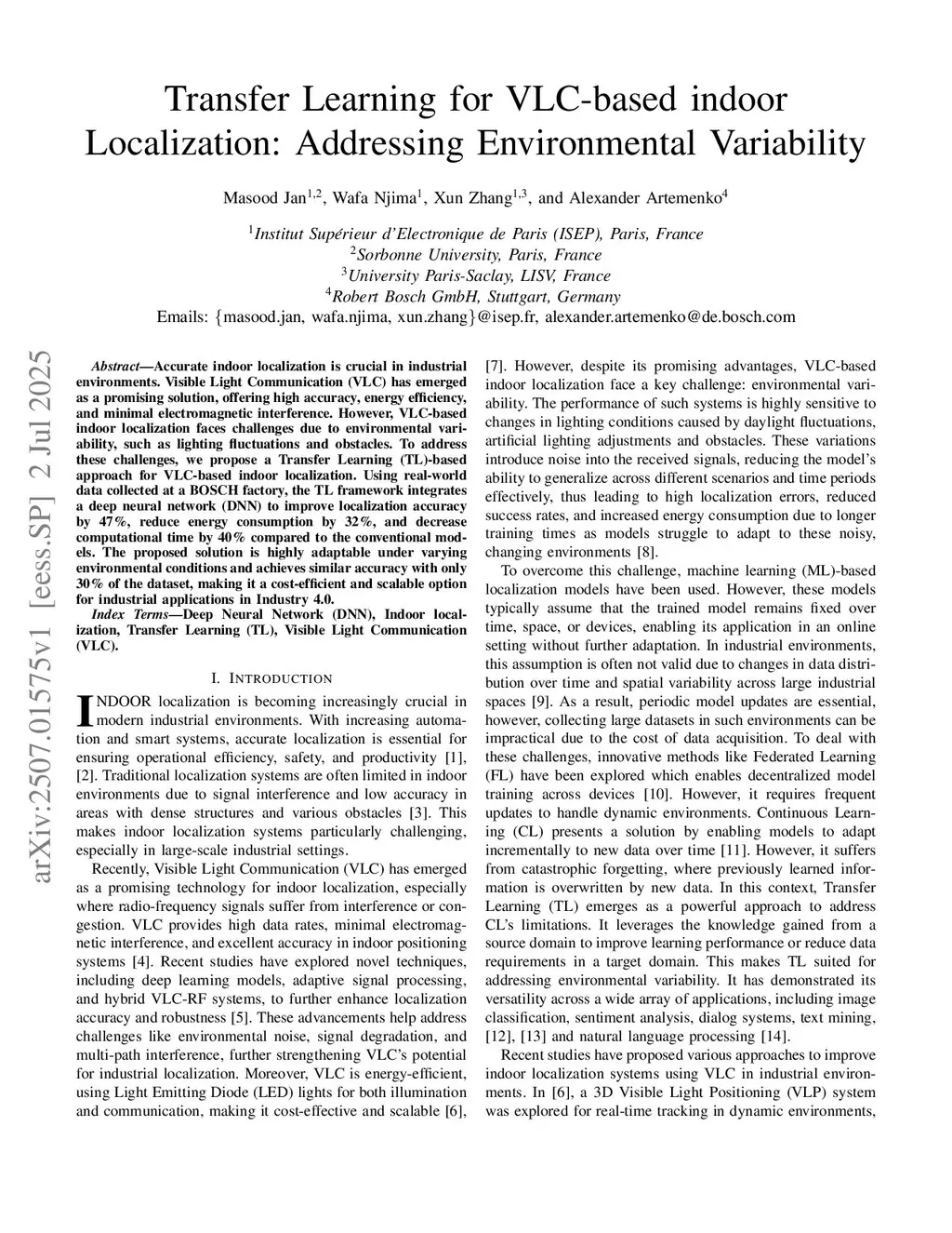 Accurate indoor localization is crucial in industrial environments. Visible Light Communication (VLC) has emerged as a promising solution, offering high accuracy, energy efficiency, and minimal electromagnetic interference. However, VLC-based indoor localization faces challenges due to environmental variability, such as lighting fluctuations and obstacles. To address these challenges, we propose a Transfer Learning (TL)-based approach for VLC-based indoor localization. Using real-world data collected at a BOSCH factory, the TL framework integrates a deep neural network (DNN) to improve localization accuracy by 47\%, reduce energy consumption by 32\%, and decrease computational time by 40\% compared to the conventional models. The proposed solution is highly adaptable under varying environmental conditions and achieves similar accuracy with only 30\% of the dataset, making it a cost-efficient and scalable option for industrial applications in Industry 4.0.
