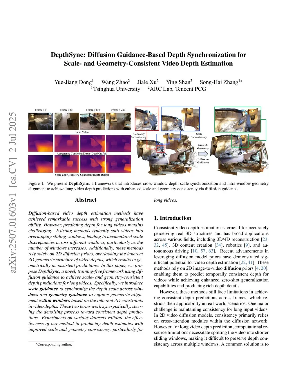 Diffusion-based video depth estimation methods have achieved remarkable success with strong generalization ability. However, predicting depth for long videos remains challenging. Existing methods typically split videos into overlapping sliding windows, leading to accumulated scale discrepancies across different windows, particularly as the number of windows increases. Additionally, these methods rely solely on 2D diffusion priors, overlooking the inherent 3D geometric structure of video depths, which results in geometrically inconsistent predictions. In this paper, we propose DepthSync, a novel, training-free framework using diffusion guidance to achieve scale- and geometry-consistent depth predictions for long videos. Specifically, we introduce scale guidance to synchronize the depth scale across windows and geometry guidance to enforce geometric alignment within windows based on the inherent 3D constraints in video depths. These two terms work synergistically, steering the denoising process toward consistent depth predictions. Experiments on various datasets validate the effectiveness of our method in producing depth estimates with improved scale and geometry consistency, particularly for long videos.