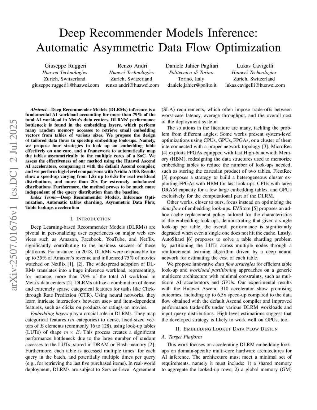 Deep Recommender Models (DLRMs) inference is a fundamental AI workload accounting for more than 79% of the total AI workload in Meta's data centers. DLRMs' performance bottleneck is found in the embedding layers, which perform many random memory accesses to retrieve small embedding vectors from tables of various sizes. We propose the design of tailored data flows to speedup embedding look-ups. Namely, we propose four strategies to look up an embedding table effectively on one core, and a framework to automatically map the tables asymmetrically to the multiple cores of a SoC. We assess the effectiveness of our method using the Huawei Ascend AI accelerators, comparing it with the default Ascend compiler, and we perform high-level comparisons with Nvidia A100. Results show a speed-up varying from 1.5x up to 6.5x for real workload distributions, and more than 20x for extremely unbalanced distributions. Furthermore, the method proves to be much more independent of the query distribution than the baseline.