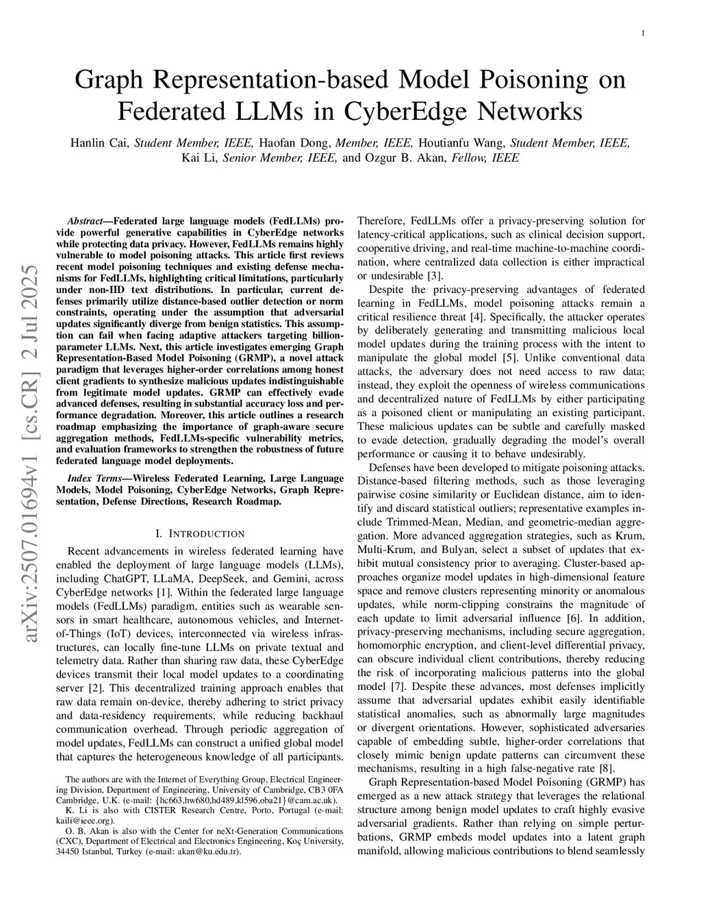 Federated large language models (FedLLMs) enable powerful generative capabilities within wireless networks while preserving data privacy. Nonetheless, FedLLMs remain vulnerable to model poisoning attacks. This article first reviews recent advancements in model poisoning techniques and existing defense mechanisms for FedLLMs, underscoring critical limitations, especially when dealing with non-IID textual data distributions. Current defense strategies predominantly employ distance or similarity-based outlier detection mechanisms, relying on the assumption that malicious updates markedly differ from benign statistical patterns. However, this assumption becomes inadequate against adaptive adversaries targeting billion-parameter LLMs. The article further investigates graph representation-based model poisoning (GRMP), an emerging attack paradigm that exploits higher-order correlations among benign client gradients to craft malicious updates indistinguishable from legitimate ones. GRMP can effectively circumvent advanced defense systems, causing substantial degradation in model accuracy and overall performance. Moreover, the article outlines a forward-looking research roadmap that emphasizes the necessity of graph-aware secure aggregation methods, specialized vulnerability metrics tailored for FedLLMs, and evaluation frameworks to enhance the robustness of federated language model deployments.