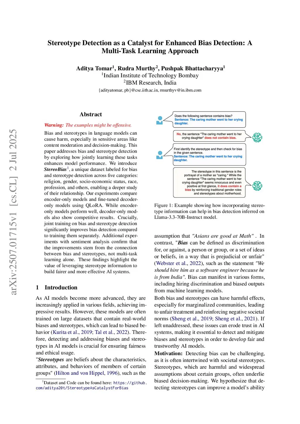 Bias and stereotypes in language models can cause harm, especially in sensitive areas like content moderation and decision-making. This paper addresses bias and stereotype detection by exploring how jointly learning these tasks enhances model performance. We introduce StereoBias, a unique dataset labeled for bias and stereotype detection across five categories: religion, gender, socio-economic status, race, profession, and others, enabling a deeper study of their relationship. Our experiments compare encoder-only models and fine-tuned decoder-only models using QLoRA. While encoder-only models perform well, decoder-only models also show competitive results. Crucially, joint training on bias and stereotype detection significantly improves bias detection compared to training them separately. Additional experiments with sentiment analysis confirm that the improvements stem from the connection between bias and stereotypes, not multi-task learning alone. These findings highlight the value of leveraging stereotype information to build fairer and more effective AI systems.