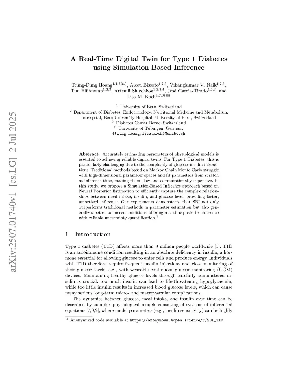 Accurately estimating parameters of physiological models is essential to achieving reliable digital twins. For Type 1 Diabetes, this is particularly challenging due to the complexity of glucose-insulin interactions. Traditional methods based on Markov Chain Monte Carlo struggle with high-dimensional parameter spaces and fit parameters from scratch at inference time, making them slow and computationally expensive. In this study, we propose a Simulation-Based Inference approach based on Neural Posterior Estimation to efficiently capture the complex relationships between meal intake, insulin, and glucose level, providing faster, amortized inference. Our experiments demonstrate that SBI not only outperforms traditional methods in parameter estimation but also generalizes better to unseen conditions, offering real-time posterior inference with reliable uncertainty quantification.