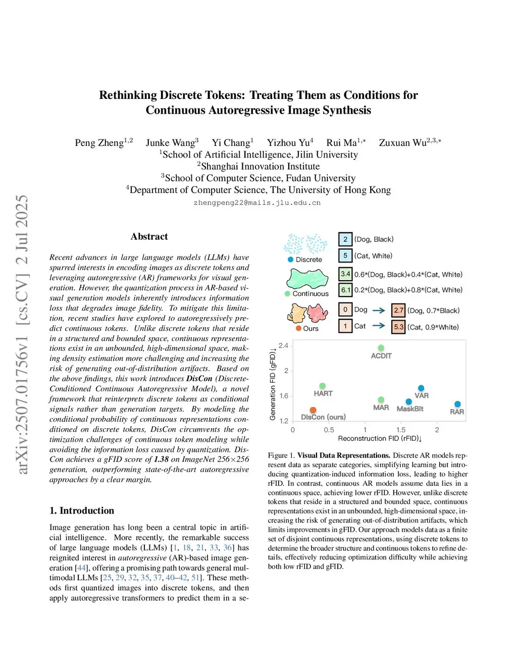 Recent advances in large language models (LLMs) have spurred interests in encoding images as discrete tokens and leveraging autoregressive (AR) frameworks for visual generation. However, the quantization process in AR-based visual generation models inherently introduces information loss that degrades image fidelity. To mitigate this limitation, recent studies have explored to autoregressively predict continuous tokens. Unlike discrete tokens that reside in a structured and bounded space, continuous representations exist in an unbounded, high-dimensional space, making density estimation more challenging and increasing the risk of generating out-of-distribution artifacts. Based on the above findings, this work introduces DisCon (Discrete-Conditioned Continuous Autoregressive Model), a novel framework that reinterprets discrete tokens as conditional signals rather than generation targets. By modeling the conditional probability of continuous representations conditioned on discrete tokens, DisCon circumvents the optimization challenges of continuous token modeling while avoiding the information loss caused by quantization. DisCon achieves a gFID score of 1.38 on ImageNet 256256 generation, outperforming state-of-the-art autoregressive approaches by a clear margin. Project page:this https URL.