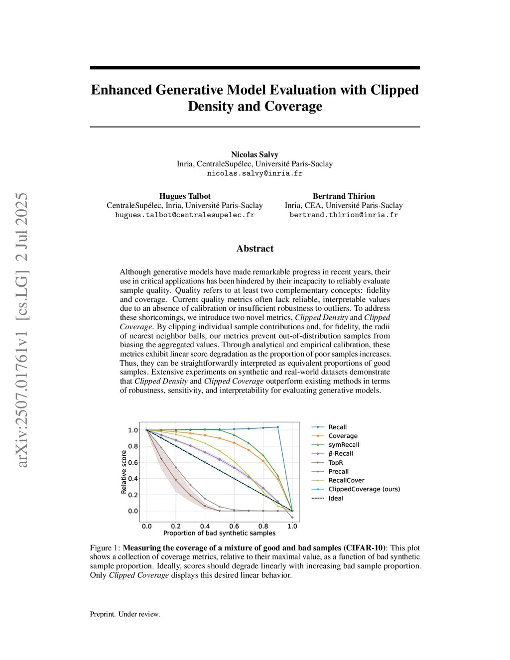 Although generative models have made remarkable progress in recent years, their use in critical applications has been hindered by an inability to reliably evaluate the quality of their generated samples. Quality refers to at least two complementary concepts: fidelity and coverage. Current quality metrics often lack reliable, interpretable values due to an absence of calibration or insufficient robustness to outliers. To address these shortcomings, we introduce two novel metrics: Clipped Density and Clipped Coverage. By clipping individual sample contributions, as well as the radii of nearest neighbor balls for fidelity, our metrics prevent out-of-distribution samples from biasing the aggregated values. Through analytical and empirical calibration, these metrics demonstrate linear score degradation as the proportion of bad samples increases. Thus, they can be straightforwardly interpreted as equivalent proportions of good samples. Extensive experiments on synthetic and real-world datasets demonstrate that Clipped Density and Clipped Coverage outperform existing methods in terms of robustness, sensitivity, and interpretability when evaluating generative models.