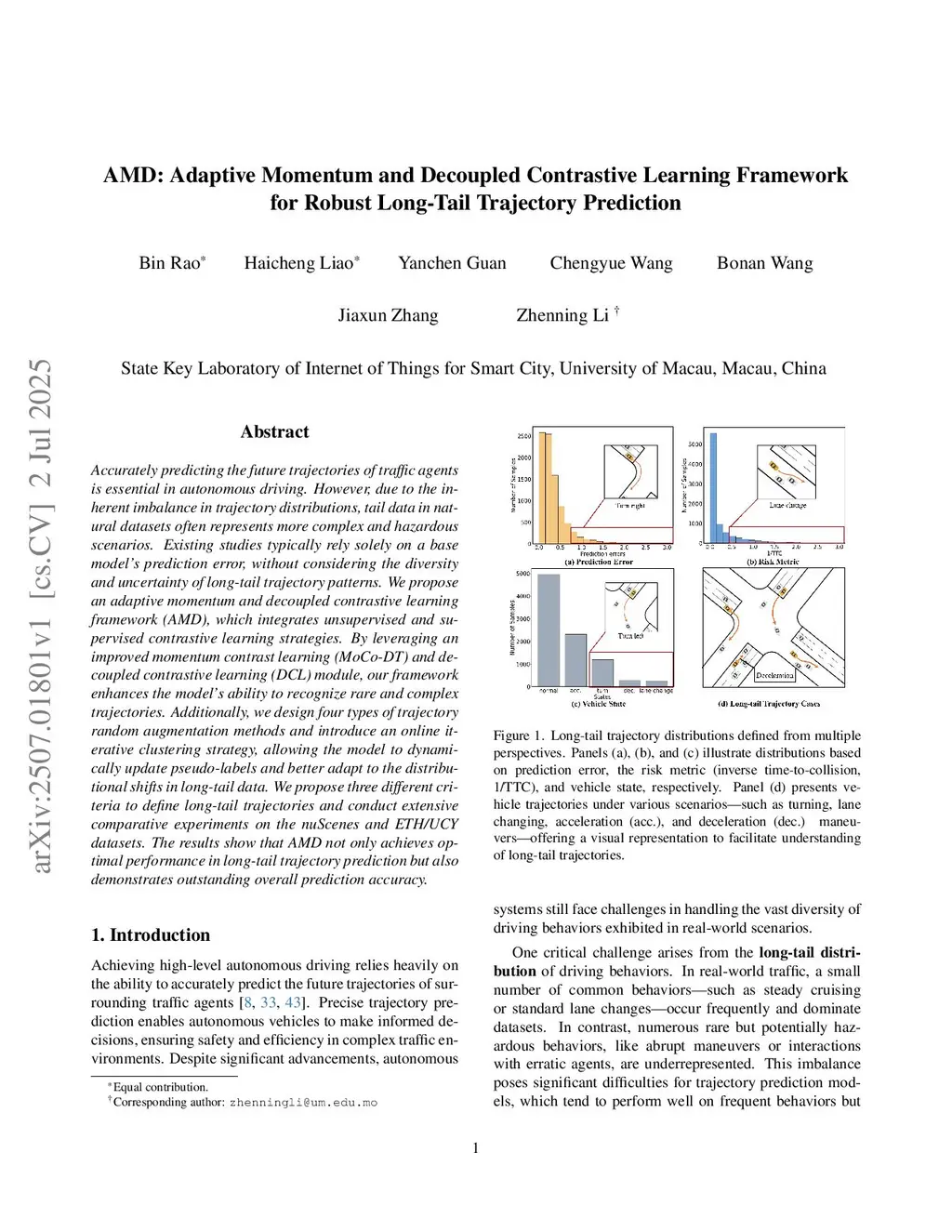 AMD: Adaptive Momentum and Decoupled Contrastive Learning Framework for Robust Long-Tail Trajectory Prediction