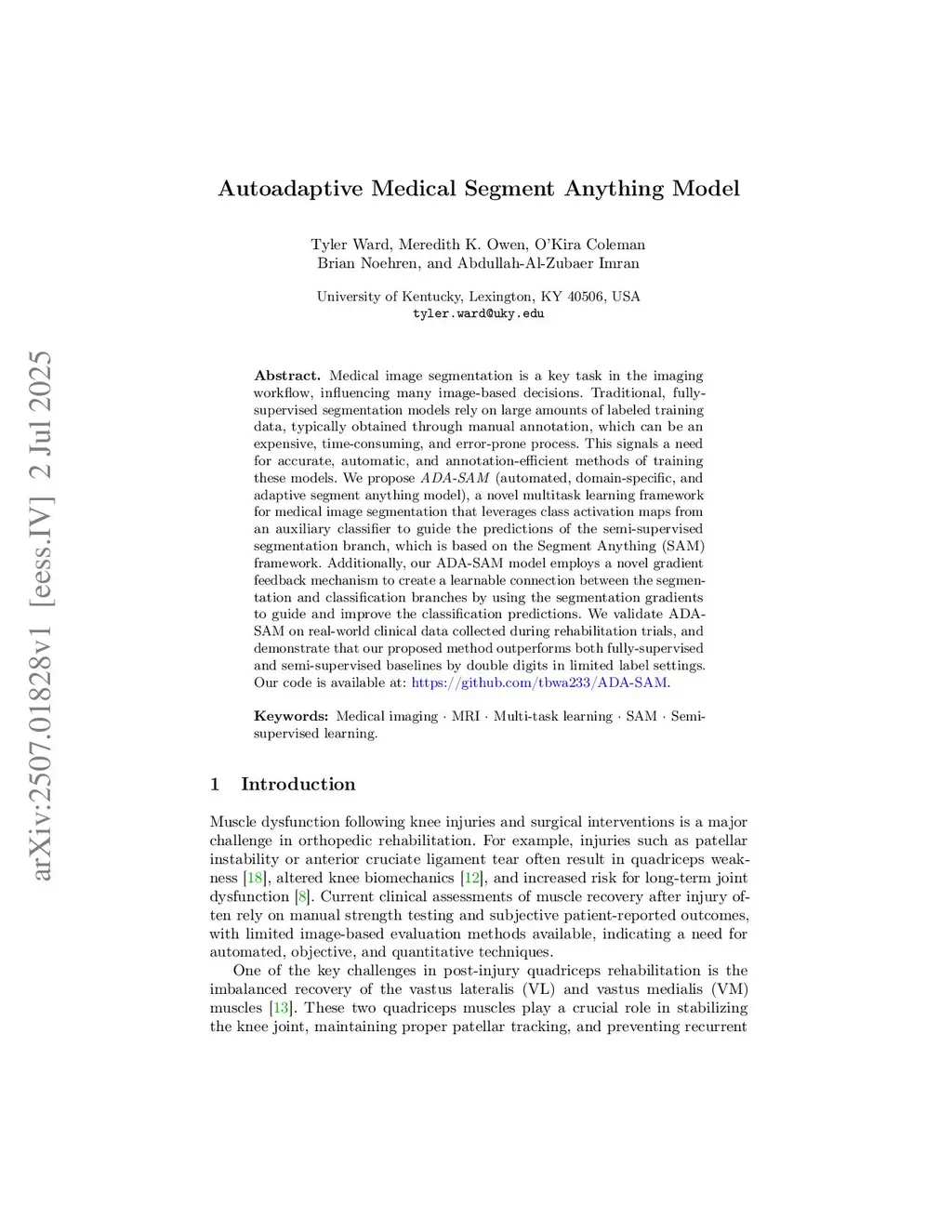 Medical image segmentation is a key task in the imaging workflow, influencing many image-based decisions. Traditional, fully-supervised segmentation models rely on large amounts of labeled training data, typically obtained through manual annotation, which can be an expensive, time-consuming, and error-prone process. This signals a need for accurate, automatic, and annotation-efficient methods of training these models. We propose ADA-SAM (automated, domain-specific, and adaptive segment anything model), a novel multitask learning framework for medical image segmentation that leverages class activation maps from an auxiliary classifier to guide the predictions of the semi-supervised segmentation branch, which is based on the Segment Anything (SAM) framework. Additionally, our ADA-SAM model employs a novel gradient feedback mechanism to create a learnable connection between the segmentation and classification branches by using the segmentation gradients to guide and improve the classification predictions. We validate ADA-SAM on real-world clinical data collected during rehabilitation trials, and demonstrate that our proposed method outperforms both fully-supervised and semi-supervised baselines by double digits in limited label settings. Our code is available at:this https URL.